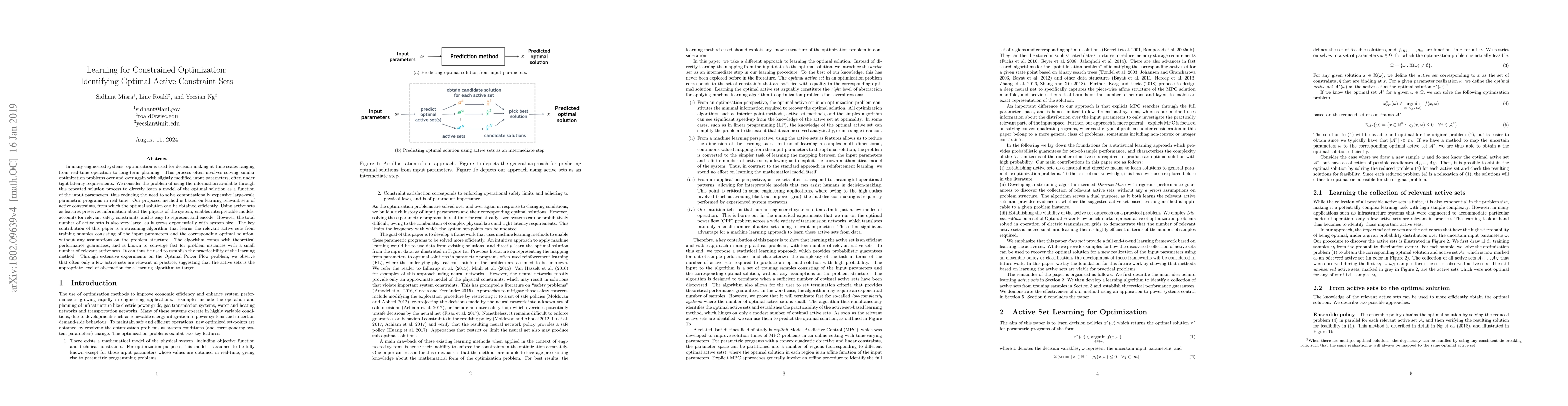 In many engineered systems, optimization is used for decision making at time-scales ranging from real-time operation to long-term planning. This process often involves solving similar optimization problems over and over again with slightly modified input parameters, often under tight latency requirements. We consider the problem of using the information available through this repeated solution process to directly learn a model of the optimal solution as a function of the input parameters, thus reducing the need to solve computationally expensive large-scale parametric programs in real time. Our proposed method is based on learning relevant sets of active constraints, from which the optimal solution can be obtained efficiently. Using active sets as features preserves information about the physics of the system, enables interpretable models, accounts for relevant safety constraints, and is easy to represent and encode. However, the total number of active sets is also very large, as it grows exponentially with system size. The key contribution of this paper is a streaming algorithm that learns the relevant active sets from training samples consisting of the input parameters and the corresponding optimal solution, without any assumptions on the problem structure. The algorithm comes with theoretical performance guarantees, and is known to converge fast for problem instances with a small number of relevant active sets. It can thus be used to establish the practicability of the learning method. Through extensive experiments on the Optimal Power Flow problem, we observe that often only a few active sets are relevant in practice, suggesting that the active sets is the appropriate level of abstraction for a learning algorithm to target.