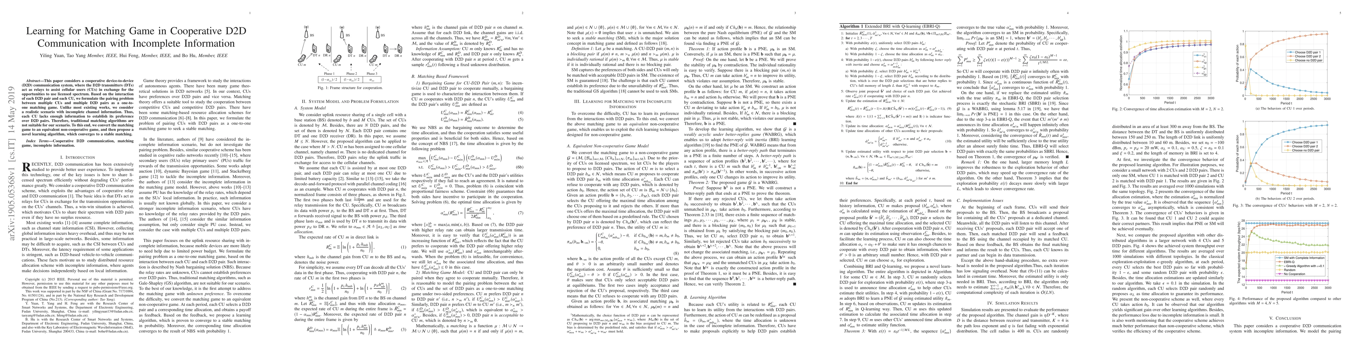 This paper proposes a novel learning algorithm for matching in cooperative D2D communication systems with incomplete channel information, converting the matching game into a non-cooperative game to achieve stable pairings. Traditional matching algorithms are unsuitable due to the lack of complete information.