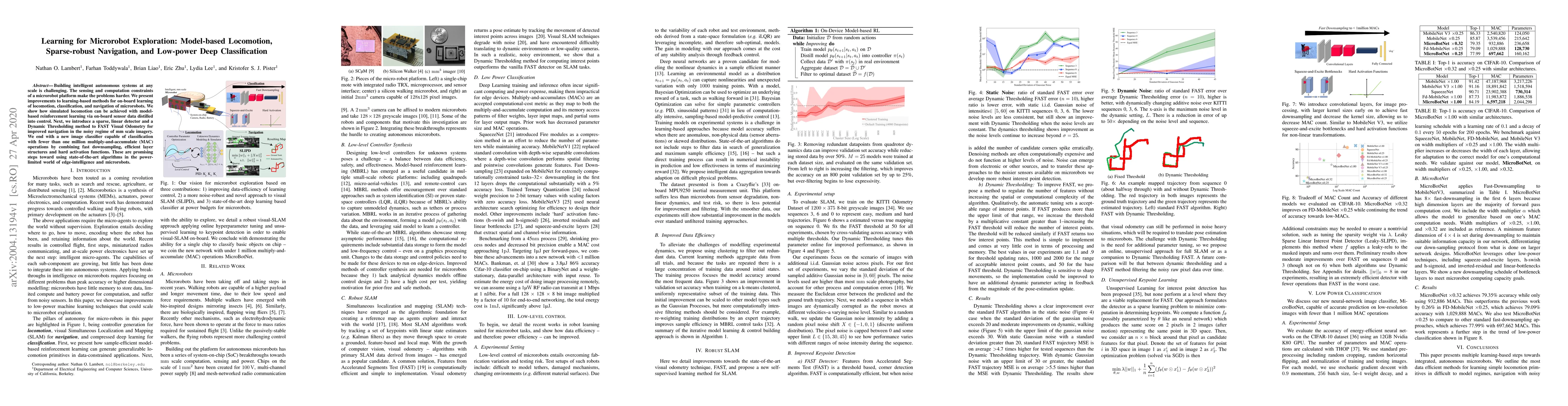 Building intelligent autonomous systems at any scale is challenging. The sensing and computation constraints of a microrobot platform make the problems harder. We present improvements to learning-based methods for on-board learning of locomotion, classification, and navigation of microrobots. We show how simulated locomotion can be achieved with model-based reinforcement learning via on-board sensor data distilled into control. Next, we introduce a sparse, linear detector and a Dynamic Thresholding method to FAST Visual Odometry for improved navigation in the noisy regime of mm scale imagery. We end with a new image classifier capable of classification with fewer than one million multiply-and-accumulate (MAC) operations by combining fast downsampling, efficient layer structures and hard activation functions. These are promising steps toward using state-of-the-art algorithms in the power-limited world of edge-intelligence and microrobots.