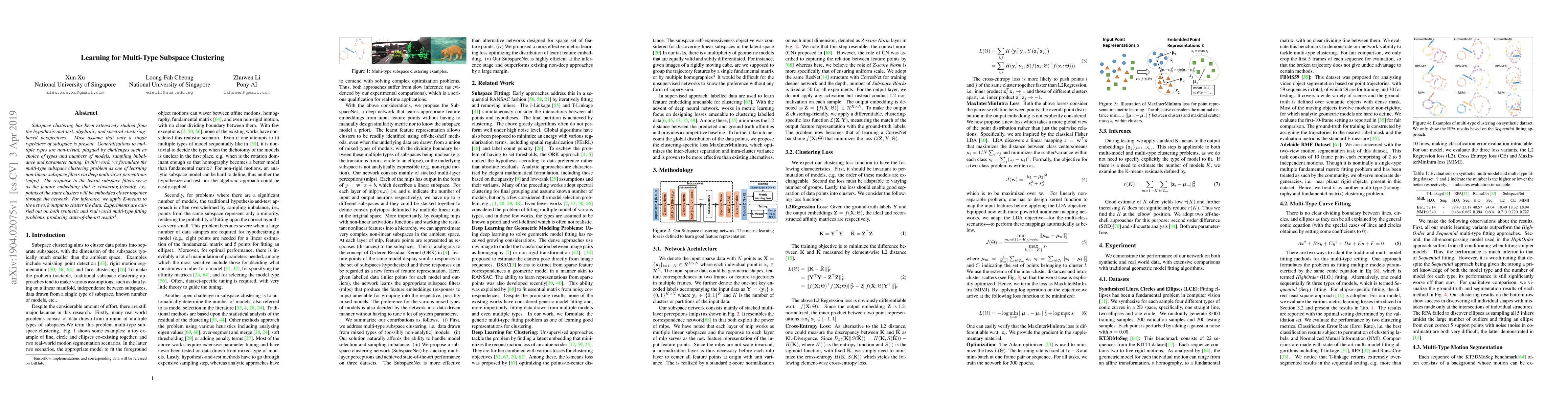 This paper proposes a deep learning approach for multi-type subspace clustering using multi-layer perceptrons to learn non-linear subspace filters, which embeds data points in a clustering-friendly manner. K-means is applied to the network output for clustering, achieving state-of-the-art results on synthetic and real-world datasets.