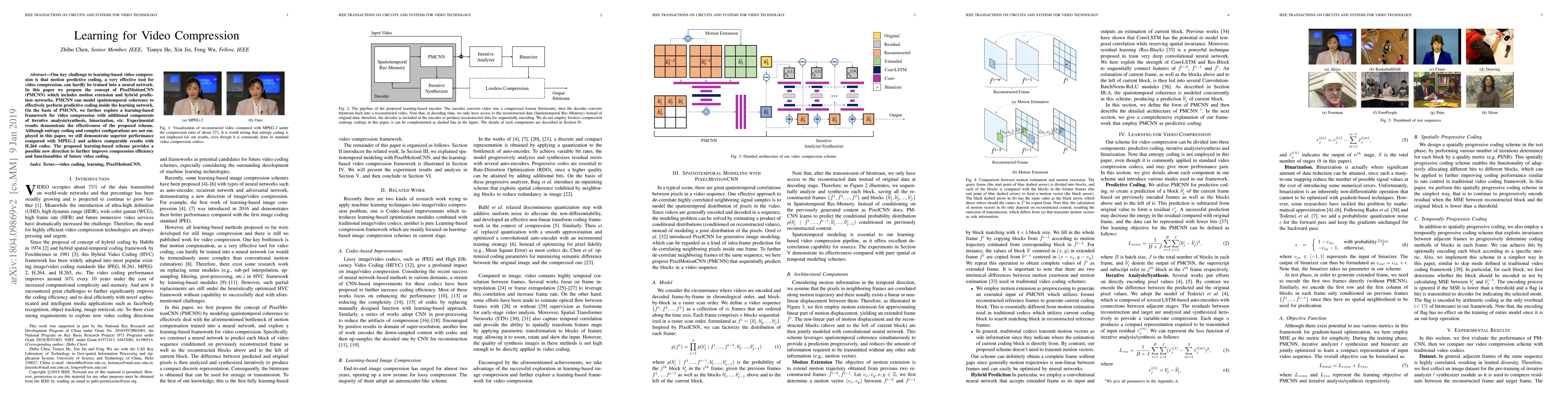 One key challenge to learning-based video compression is that motion predictive coding, a very effective tool for video compression, can hardly be trained into a neural network. In this paper we propose the concept of PixelMotionCNN (PMCNN) which includes motion extension and hybrid prediction networks. PMCNN can model spatiotemporal coherence to effectively perform predictive coding inside the learning network. On the basis of PMCNN, we further explore a learning-based framework for video compression with additional components of iterative analysis/synthesis, binarization, etc. Experimental results demonstrate the effectiveness of the proposed scheme. Although entropy coding and complex configurations are not employed in this paper, we still demonstrate superior performance compared with MPEG-2 and achieve comparable results with H.264 codec. The proposed learning-based scheme provides a possible new direction to further improve compression efficiency and functionalities of future video coding.