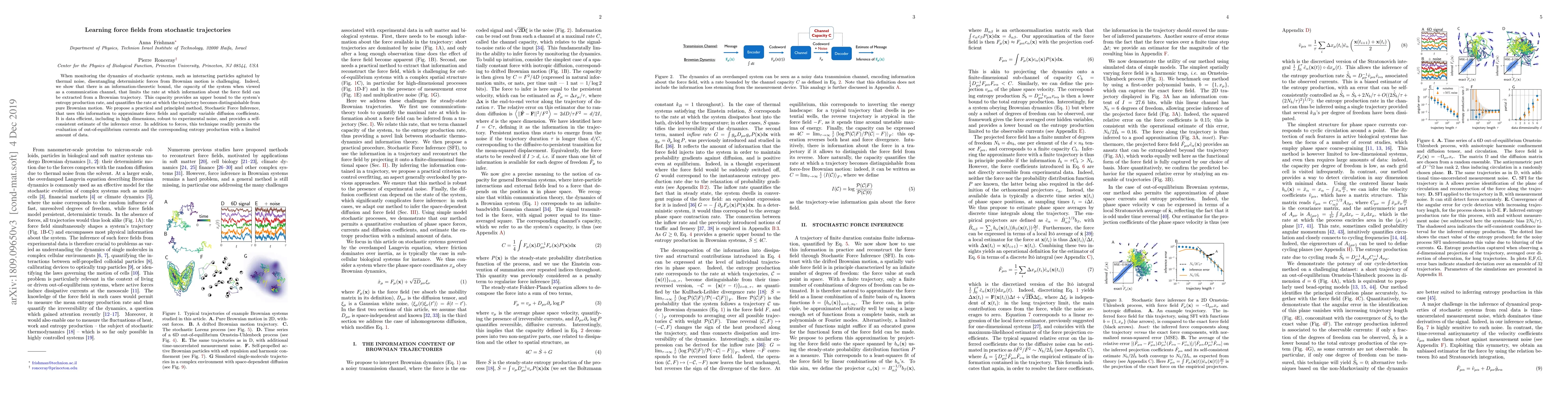 When monitoring the dynamics of stochastic systems, such as interacting particles agitated by thermal noise, disentangling deterministic forces from Brownian motion is challenging. Indeed, we show that there is an information-theoretic bound, the capacity of the system when viewed as a communication channel, that limits the rate at which information about the force field can be extracted from a Brownian trajectory. This capacity provides an upper bound to the system's entropy production rate, and quantifies the rate at which the trajectory becomes distinguishable from pure Brownian motion. We propose a practical and principled method, Stochastic Force Inference, that uses this information to approximate force fields and spatially variable diffusion coefficients. It is data efficient, including in high dimensions, robust to experimental noise, and provides a self-consistent estimate of the inference error. In addition to forces, this technique readily permits the evaluation of out-of-equilibrium currents and the corresponding entropy production with a limited amount of data.