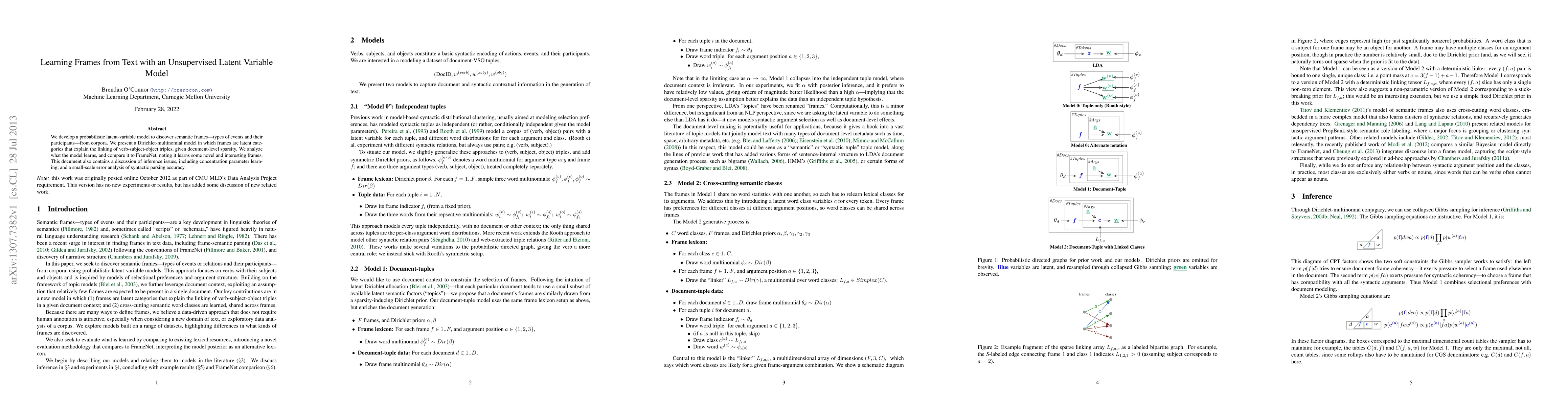 We develop a probabilistic latent-variable model to discover semantic frames---types of events and their participants---from corpora. We present a Dirichlet-multinomial model in which frames are latent categories that explain the linking of verb-subject-object triples, given document-level sparsity. We analyze what the model learns, and compare it to FrameNet, noting it learns some novel and interesting frames. This document also contains a discussion of inference issues, including concentration parameter learning; and a small-scale error analysis of syntactic parsing accuracy.