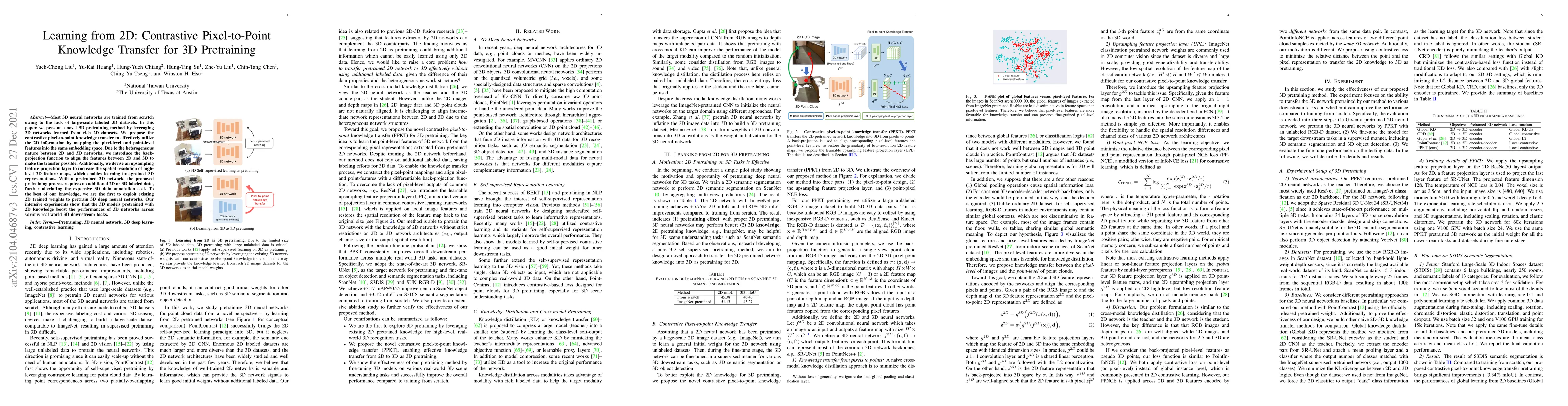 This paper introduces a novel method for pretraining 3D neural networks using 2D networks, employing contrastive pixel-to-point knowledge transfer to map features into a common embedding space. The approach leverages existing 2D datasets without requiring additional labeled data, significantly reducing the cost of 3D data annotation.