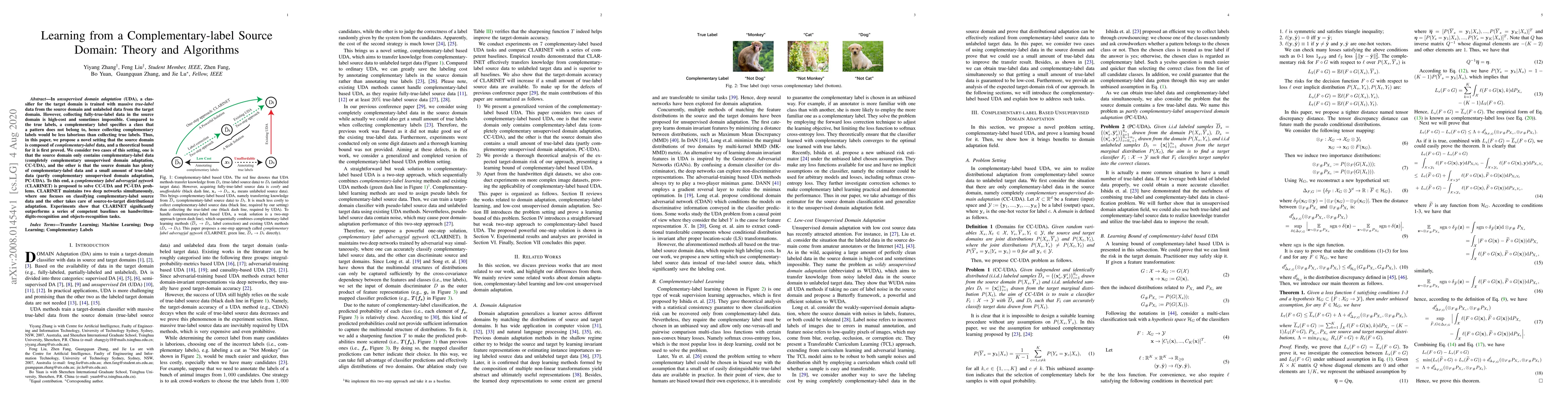 This paper introduces a novel unsupervised domain adaptation framework using complementary-label data from a source domain to train a classifier for a target domain. The proposed CLARINET network effectively addresses two scenarios: completely complementary and partly complementary unsupervised domain adaptation, outperforming baselines in recognition tasks.