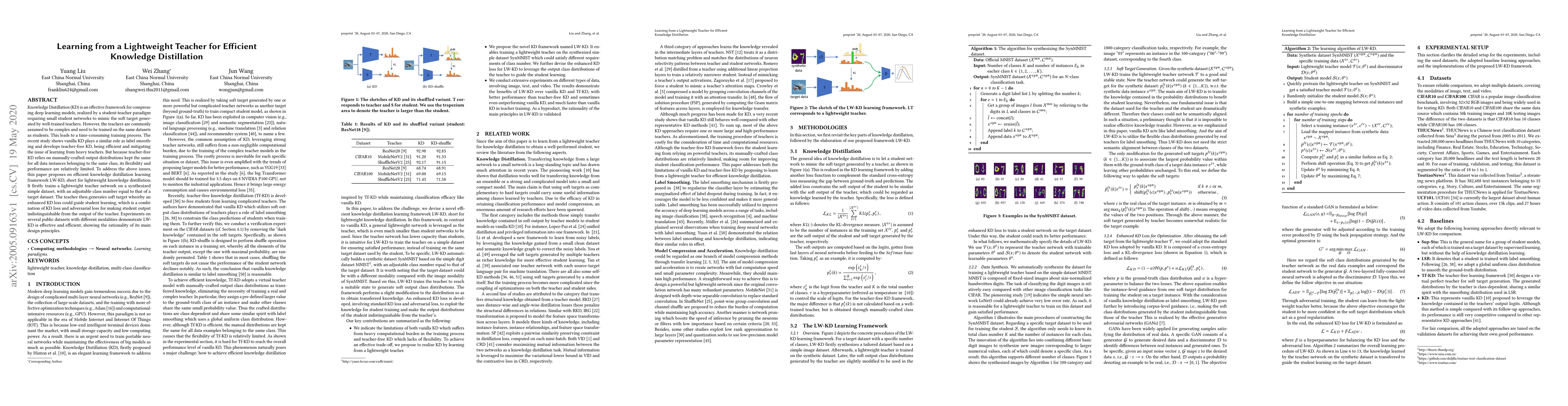 Knowledge Distillation (KD) is an effective framework for compressing deep learning models, realized by a student-teacher paradigm requiring small student networks to mimic the soft target generated by well-trained teachers. However, the teachers are commonly assumed to be complex and need to be trained on the same datasets as students. This leads to a time-consuming training process. The recent study shows vanilla KD plays a similar role as label smoothing and develops teacher-free KD, being efficient and mitigating the issue of learning from heavy teachers. But because teacher-free KD relies on manually-crafted output distributions kept the same for all data instances belonging to the same class, its flexibility and performance are relatively limited. To address the above issues, this paper proposes en efficient knowledge distillation learning framework LW-KD, short for lightweight knowledge distillation. It firstly trains a lightweight teacher network on a synthesized simple dataset, with an adjustable class number equal to that of a target dataset. The teacher then generates soft target whereby an enhanced KD loss could guide student learning, which is a combination of KD loss and adversarial loss for making student output indistinguishable from the output of the teacher. Experiments on several public datasets with different modalities demonstrate LWKD is effective and efficient, showing the rationality of its main design principles.