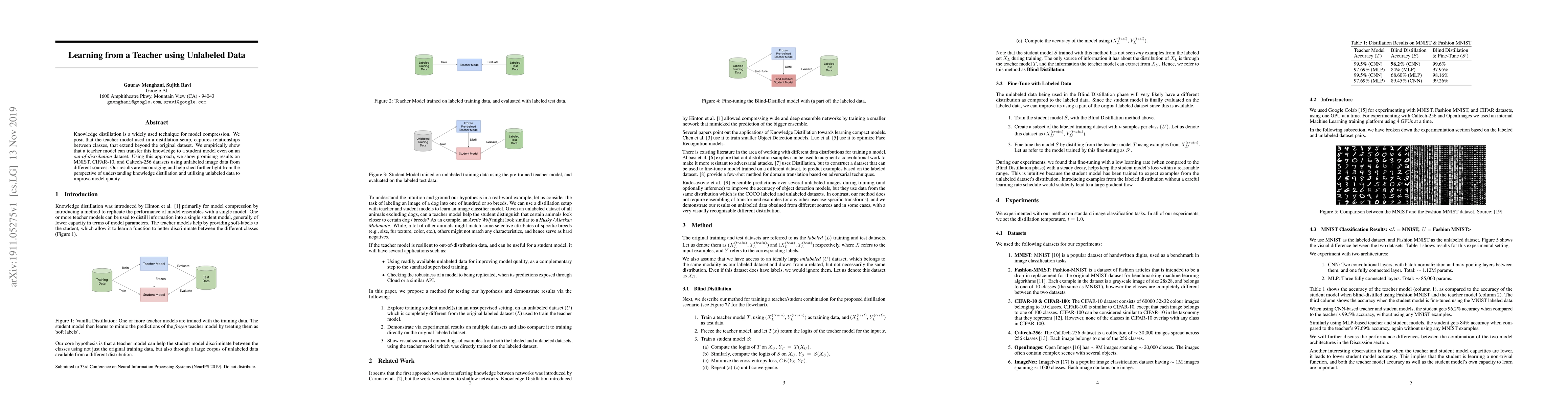 This paper explores knowledge distillation using a teacher model to transfer knowledge beyond the original dataset to a student model, even on out-of-distribution datasets. The approach shows promising results on multiple image datasets using unlabeled data, highlighting the potential of utilizing unlabeled data to enhance model performance.