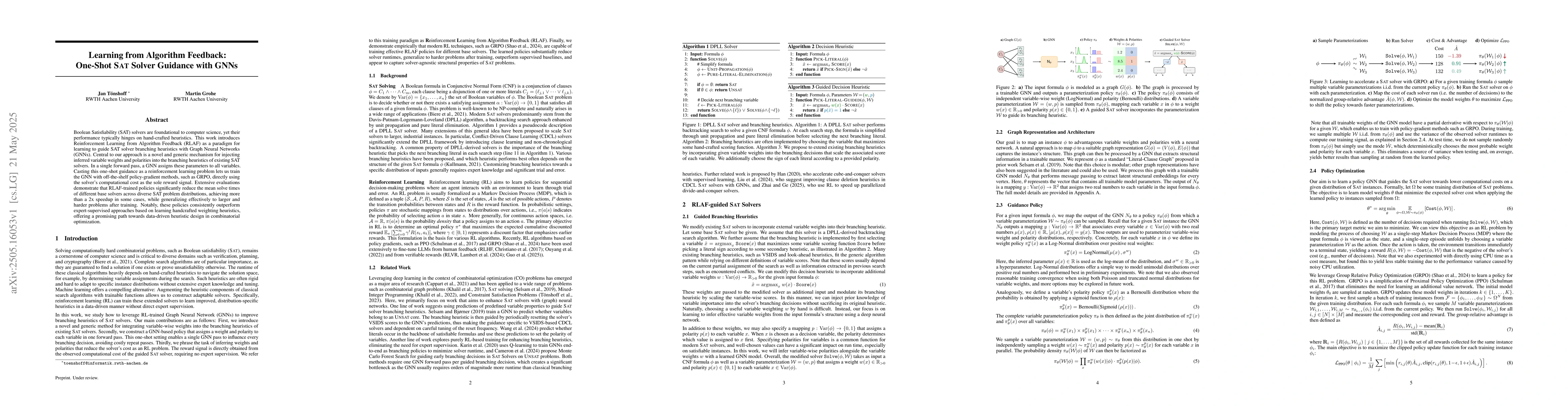 This work is novel in its application of reinforcement learning from algorithm feedback with GNNs for guiding SAT solvers, outperforming traditional handcrafted heuristics and demonstrating generalization to harder problems.