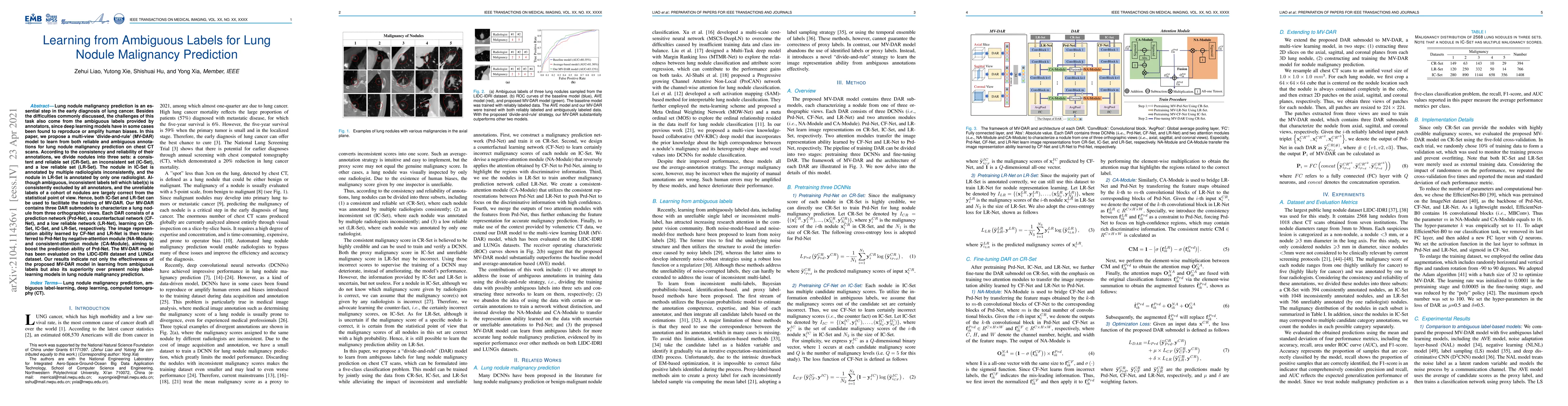 This paper proposes a multi-view "divide-and-rule" (MV-DAR) model to predict lung nodule malignancy using ambiguous labels. The model divides nodules into three sets based on annotation reliability and uses three submodels to learn from each set, transferring learned representations to enhance prediction accuracy.