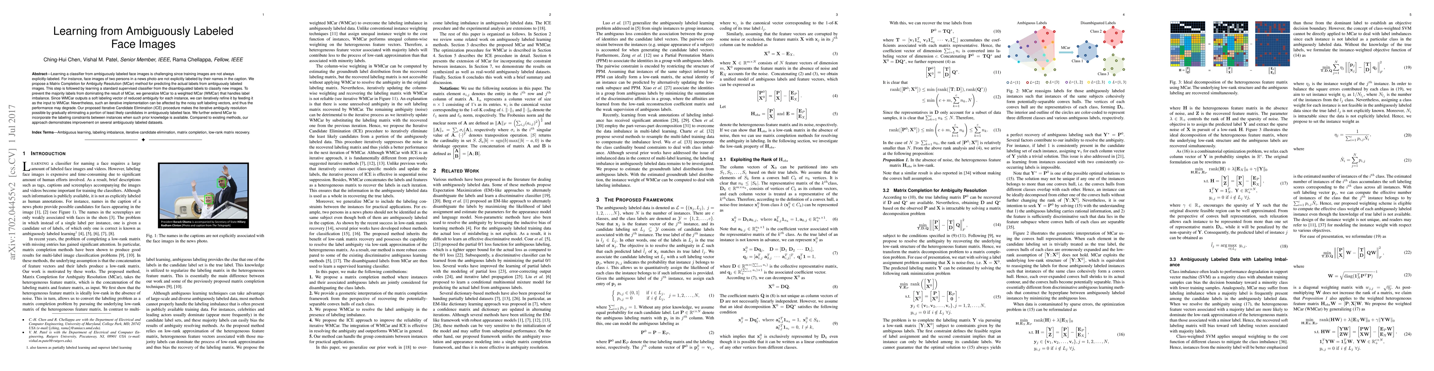 Learning a classifier from ambiguously labeled face images is challenging since training images are not always explicitly-labeled. For instance, face images of two persons in a news photo are not explicitly labeled by their names in the caption. We propose a Matrix Completion for Ambiguity Resolution (MCar) method for predicting the actual labels from ambiguously labeled images. This step is followed by learning a standard supervised classifier from the disambiguated labels to classify new images. To prevent the majority labels from dominating the result of MCar, we generalize MCar to a weighted MCar (WMCar) that handles label imbalance. Since WMCar outputs a soft labeling vector of reduced ambiguity for each instance, we can iteratively refine it by feeding it as the input to WMCar. Nevertheless, such an iterative implementation can be affected by the noisy soft labeling vectors, and thus the performance may degrade. Our proposed Iterative Candidate Elimination (ICE) procedure makes the iterative ambiguity resolution possible by gradually eliminating a portion of least likely candidates in ambiguously labeled face. We further extend MCar to incorporate the labeling constraints between instances when such prior knowledge is available. Compared to existing methods, our approach demonstrates improvement on several ambiguously labeled datasets.