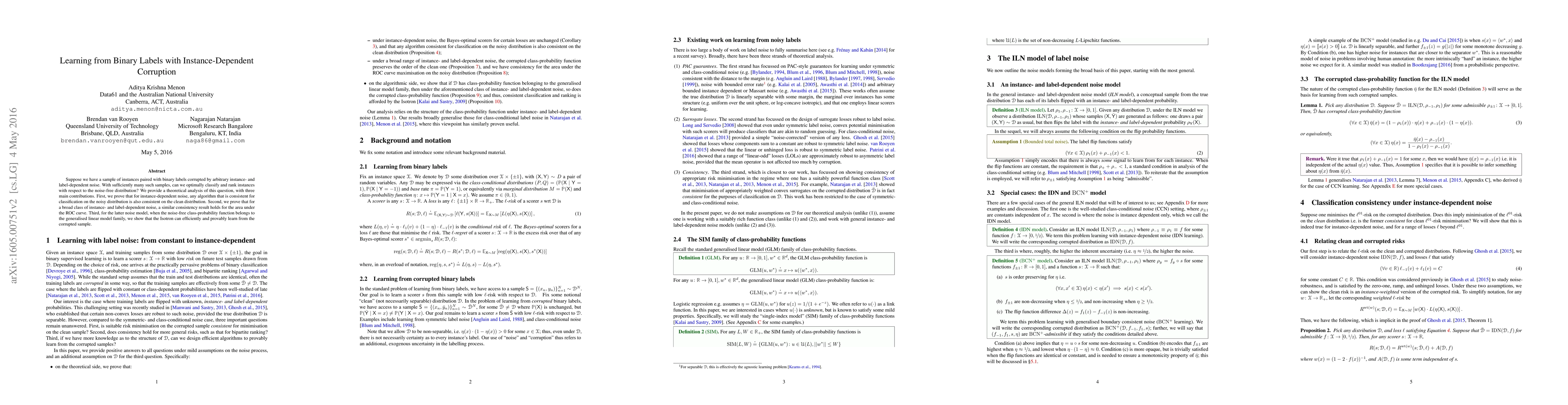 Suppose we have a sample of instances paired with binary labels corrupted by arbitrary instance- and label-dependent noise. With sufficiently many such samples, can we optimally classify and rank instances with respect to the noise-free distribution? We provide a theoretical analysis of this question, with three main contributions. First, we prove that for instance-dependent noise, any algorithm that is consistent for classification on the noisy distribution is also consistent on the clean distribution. Second, we prove that for a broad class of instance- and label-dependent noise, a similar consistency result holds for the area under the ROC curve. Third, for the latter noise model, when the noise-free class-probability function belongs to the generalised linear model family, we show that the Isotron can efficiently and provably learn from the corrupted sample.