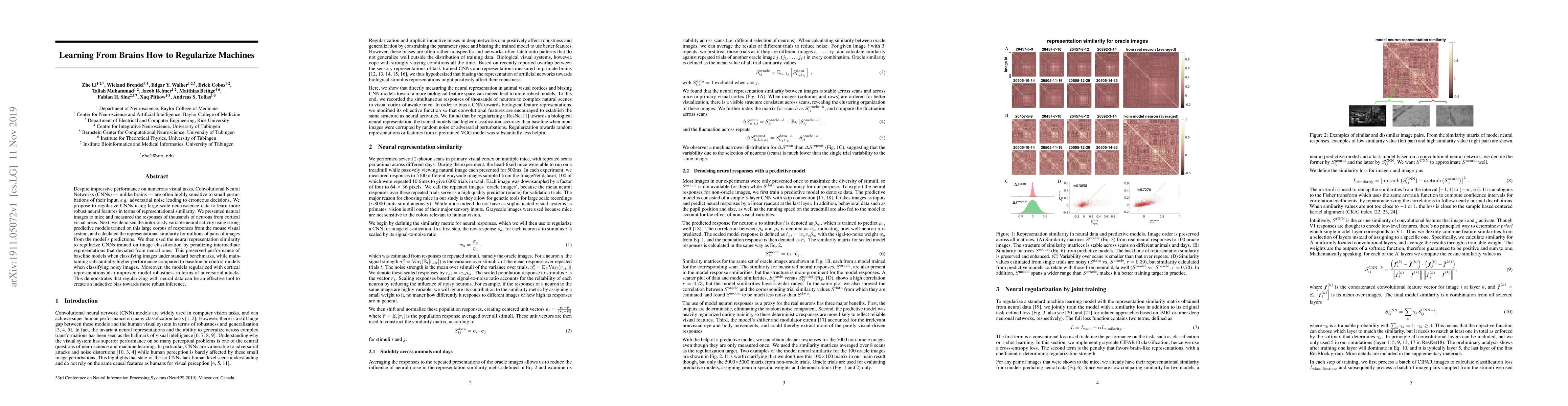 Despite impressive performance on numerous visual tasks, Convolutional Neural Networks (CNNs) --- unlike brains --- are often highly sensitive to small perturbations of their input, e.g. adversarial noise leading to erroneous decisions. We propose to regularize CNNs using large-scale neuroscience data to learn more robust neural features in terms of representational similarity. We presented natural images to mice and measured the responses of thousands of neurons from cortical visual areas. Next, we denoised the notoriously variable neural activity using strong predictive models trained on this large corpus of responses from the mouse visual system, and calculated the representational similarity for millions of pairs of images from the model's predictions. We then used the neural representation similarity to regularize CNNs trained on image classification by penalizing intermediate representations that deviated from neural ones. This preserved performance of baseline models when classifying images under standard benchmarks, while maintaining substantially higher performance compared to baseline or control models when classifying noisy images. Moreover, the models regularized with cortical representations also improved model robustness in terms of adversarial attacks. This demonstrates that regularizing with neural data can be an effective tool to create an inductive bias towards more robust inference.