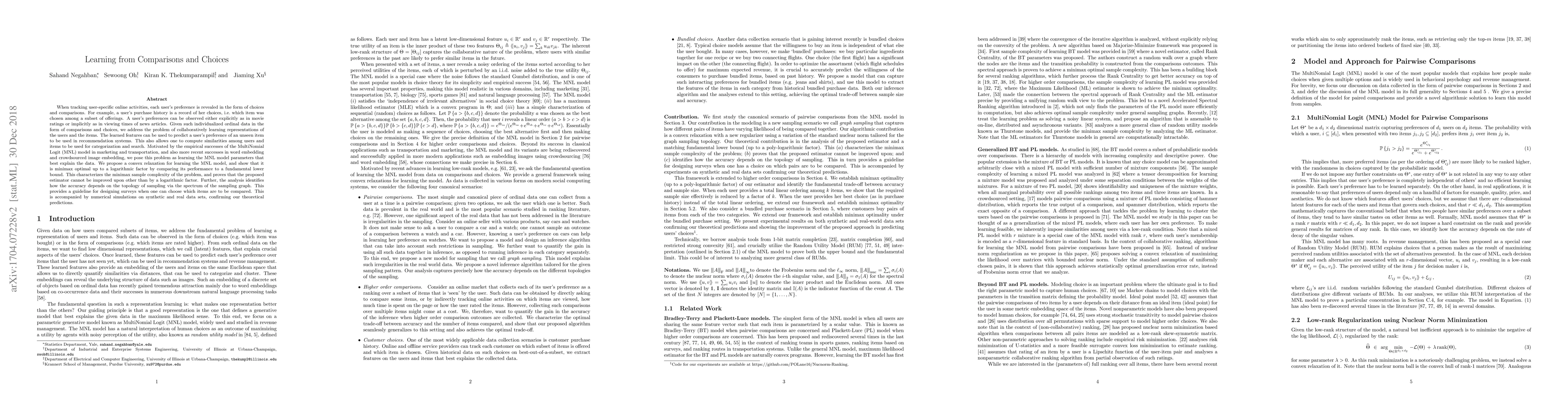 When tracking user-specific online activities, each user's preference is revealed in the form of choices and comparisons. For example, a user's purchase history is a record of her choices, i.e. which item was chosen among a subset of offerings. A user's preferences can be observed either explicitly as in movie ratings or implicitly as in viewing times of news articles. Given such individualized ordinal data in the form of comparisons and choices, we address the problem of collaboratively learning representations of the users and the items. The learned features can be used to predict a user's preference of an unseen item to be used in recommendation systems. This also allows one to compute similarities among users and items to be used for categorization and search. Motivated by the empirical successes of the MultiNomial Logit (MNL) model in marketing and transportation, and also more recent successes in word embedding and crowdsourced image embedding, we pose this problem as learning the MNL model parameters that best explain the data. We propose a convex relaxation for learning the MNL model, and show that it is minimax optimal up to a logarithmic factor by comparing its performance to a fundamental lower bound. This characterizes the minimax sample complexity of the problem, and proves that the proposed estimator cannot be improved upon other than by a logarithmic factor. Further, the analysis identifies how the accuracy depends on the topology of sampling via the spectrum of the sampling graph. This provides a guideline for designing surveys when one can choose which items are to be compared. This is accompanied by numerical simulations on synthetic and real data sets, confirming our theoretical predictions.