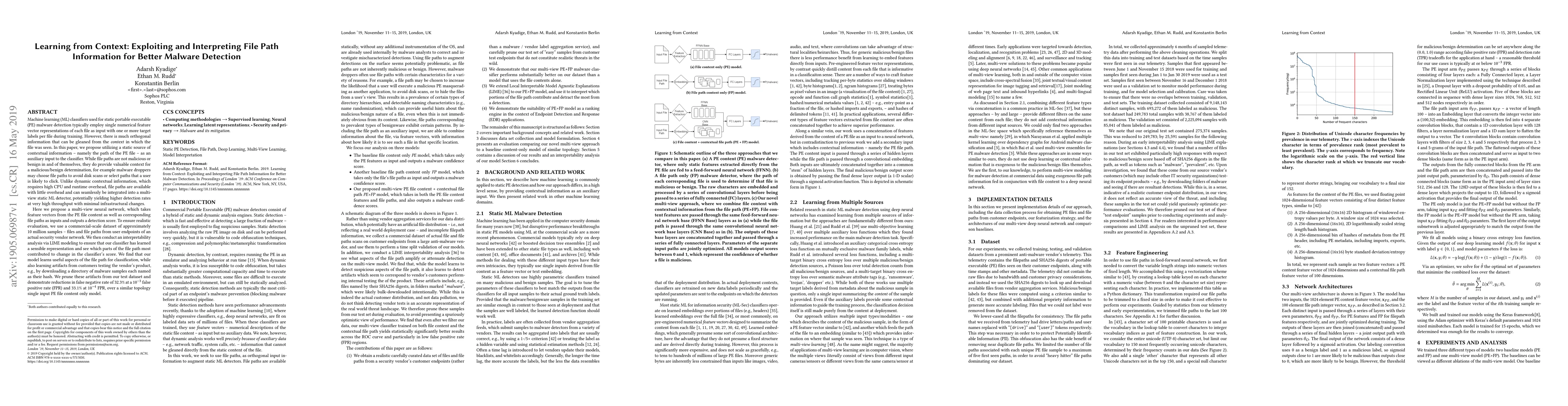 This paper proposes using file paths as contextual information to enhance static malware detection through machine learning. A multi-view neural network is used to integrate file content and path features, achieving higher detection rates with minimal infrastructure changes. The study demonstrates a significant reduction in false negatives by pruning irrelevant artifacts from file paths.