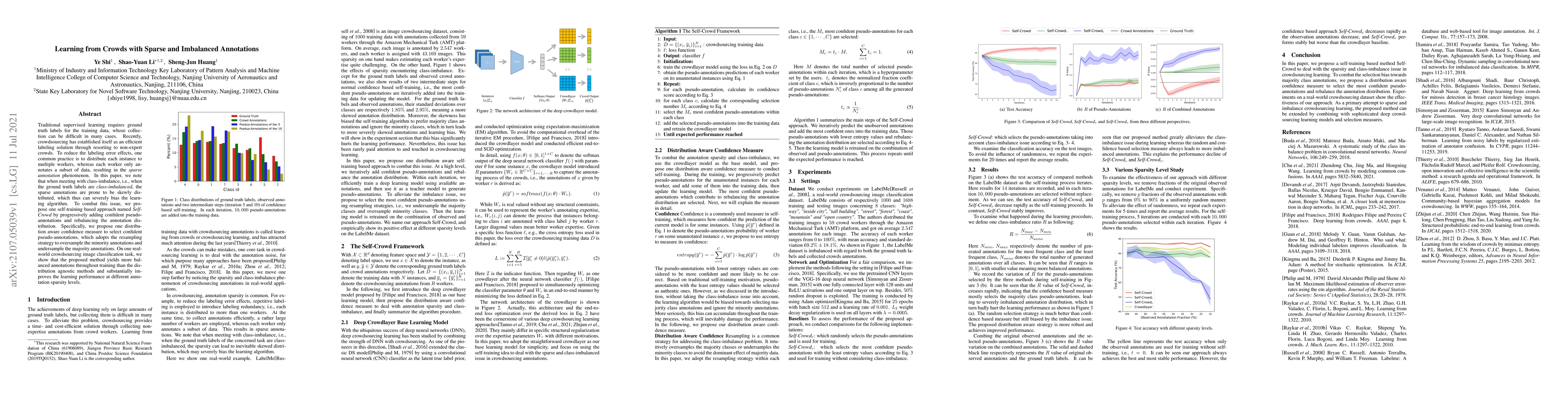 This paper proposes a self-training approach named Self-Crowd to address the bias in sparse and imbalanced annotations from crowdsourcing. It uses a distribution-aware confidence measure and resampling strategy to generate balanced pseudo-annotations, significantly improving learning performance in a real-world image classification task.