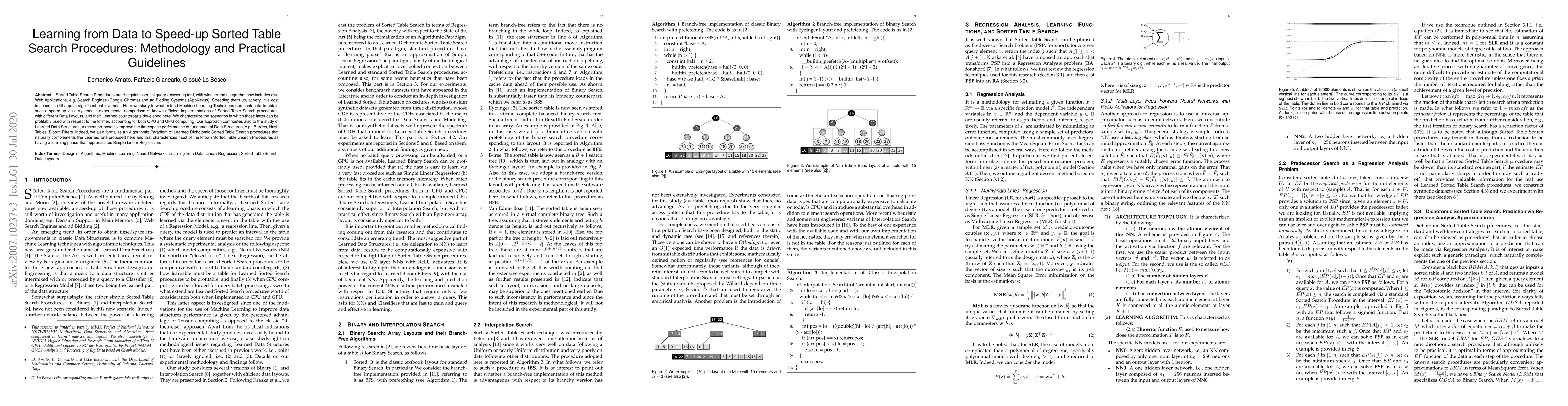 Sorted Table Search Procedures are the quintessential query-answering tool, with widespread usage that now includes also Web Applications, e.g, Search Engines (Google Chrome) and ad Bidding Systems (AppNexus). Speeding them up, at very little cost in space, is still a quite significant achievement. Here we study to what extend Machine Learning Techniques can contribute to obtain such a speed-up via a systematic experimental comparison of known efficient implementations of Sorted Table Search procedures, with different Data Layouts, and their Learned counterparts developed here. We characterize the scenarios in which those latter can be profitably used with respect to the former, accounting for both CPU and GPU computing. Our approach contributes also to the study of Learned Data Structures, a recent proposal to improve the time/space performance of fundamental Data Structures, e.g., B-trees, Hash Tables, Bloom Filters. Indeed, we also formalize an Algorithmic Paradigm of Learned Dichotomic Sorted Table Search procedures that naturally complements the Learned one proposed here and that characterizes most of the known Sorted Table Search Procedures as having a "learning phase" that approximates Simple Linear Regression.