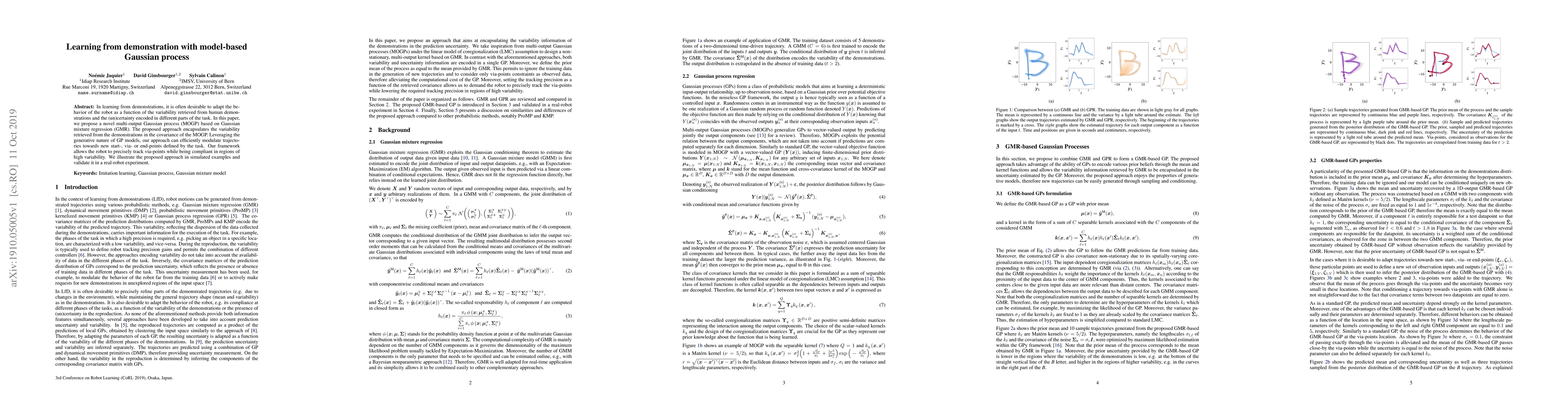 This paper proposes a novel multi-output Gaussian process based on Gaussian mixture regression to adapt robot behavior in learning from demonstrations. The approach efficiently modulates trajectories and allows precise tracking of via-points while being compliant in high variability regions, demonstrated through simulations and real-robot experiments.