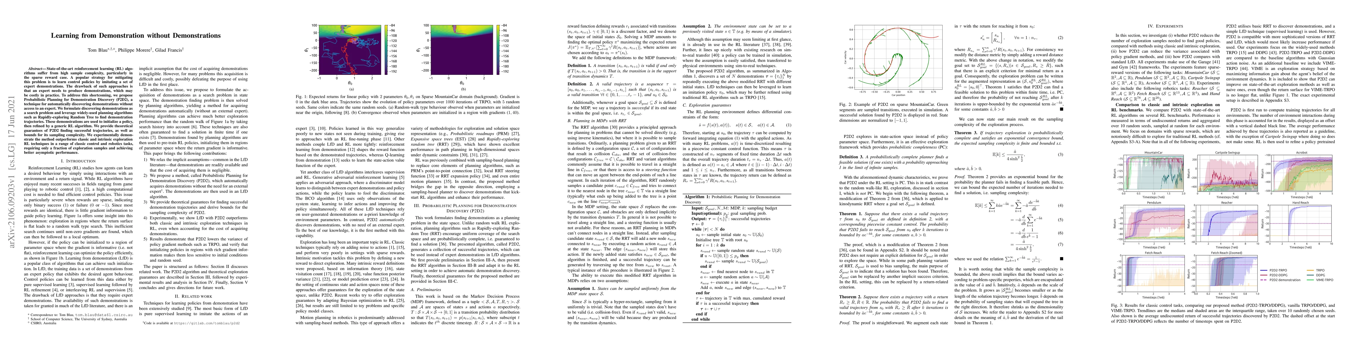 State-of-the-art reinforcement learning (RL) algorithms suffer from high sample complexity, particularly in the sparse reward case. A popular strategy for mitigating this problem is to learn control policies by imitating a set of expert demonstrations. The drawback of such approaches is that an expert needs to produce demonstrations, which may be costly in practice. To address this shortcoming, we propose Probabilistic Planning for Demonstration Discovery (P2D2), a technique for automatically discovering demonstrations without access to an expert. We formulate discovering demonstrations as a search problem and leverage widely-used planning algorithms such as Rapidly-exploring Random Tree to find demonstration trajectories. These demonstrations are used to initialize a policy, then refined by a generic RL algorithm. We provide theoretical guarantees of P2D2 finding successful trajectories, as well as bounds for its sampling complexity. We experimentally demonstrate the method outperforms classic and intrinsic exploration RL techniques in a range of classic control and robotics tasks, requiring only a fraction of exploration samples and achieving better asymptotic performance.