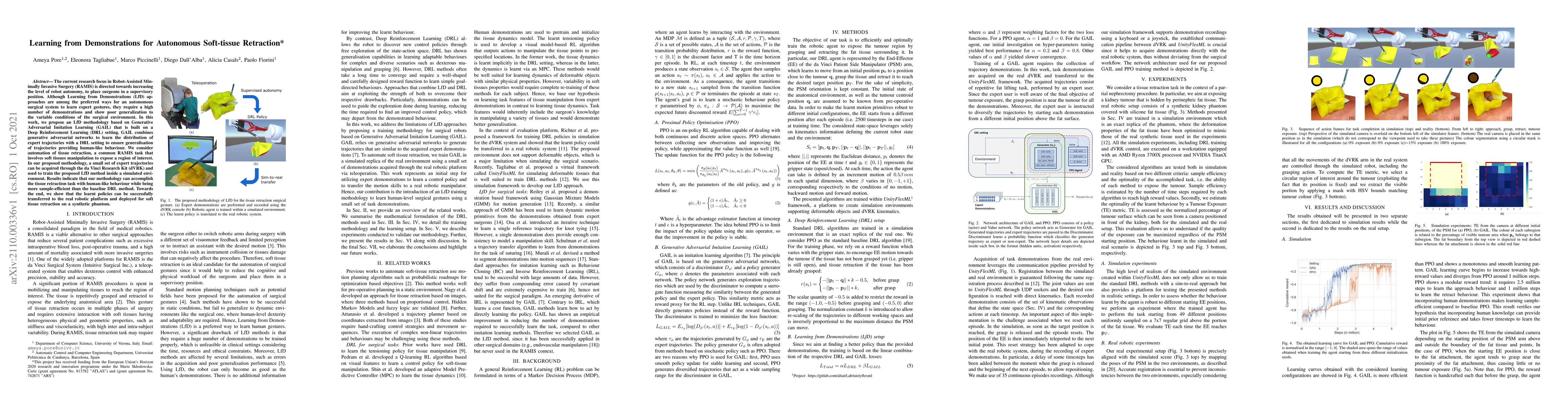 This paper proposes an LfD methodology based on GAIL within a DRL framework to enhance autonomous soft-tissue retraction in RAMIS. The approach demonstrates improved sample efficiency and generalization compared to baseline DRL methods, successfully transferring learned policies to a real robotic platform for practical tissue retraction tasks.