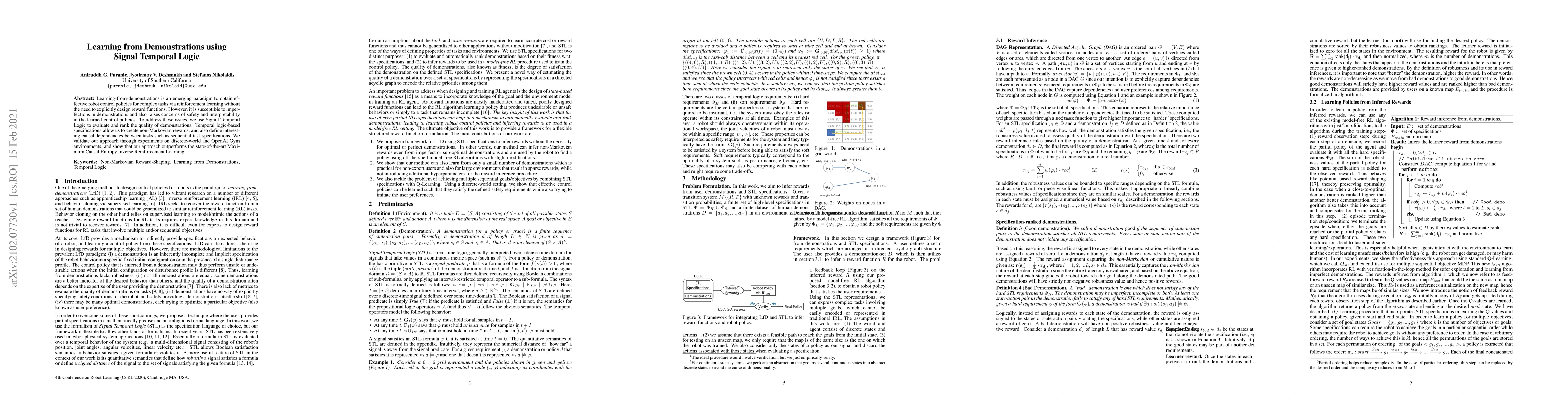 This paper proposes using Signal Temporal Logic to evaluate and rank demonstrations in learning-from-demonstrations, addressing issues of safety and interpretability. The approach creates non-Markovian rewards and defines task dependencies, outperforming Maximum Causal Entropy Inverse Reinforcement Learning in experiments.