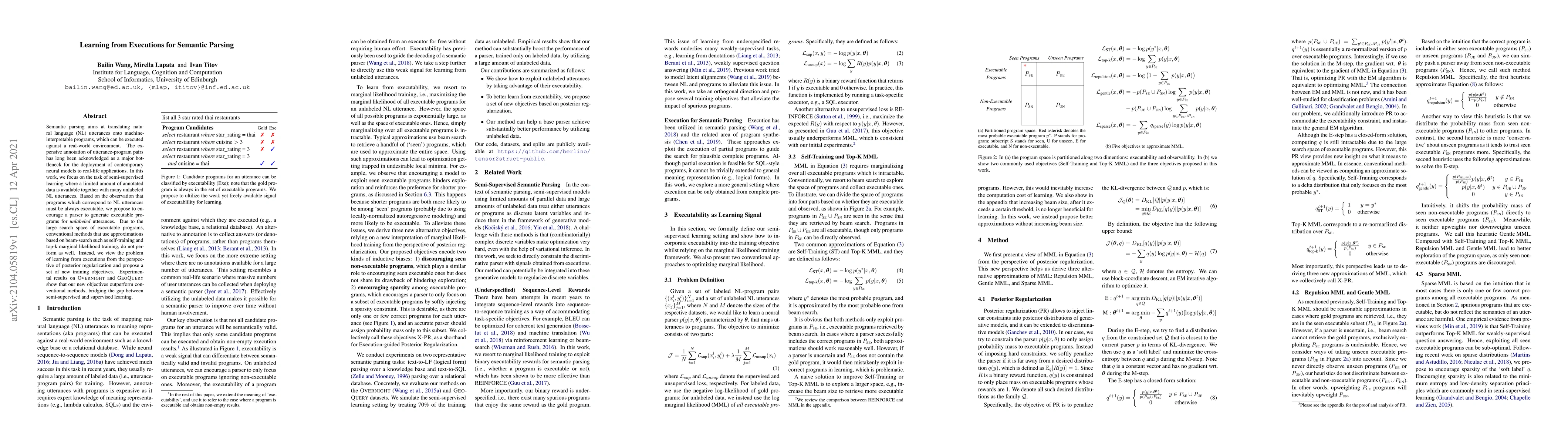 This paper proposes a semi-supervised learning approach for semantic parsing that leverages the executability of programs to generate better parsers with limited annotated data. By introducing new training objectives based on posterior regularization, the method outperforms conventional methods, demonstrating improved performance on Overnight and GeoQuery datasets.