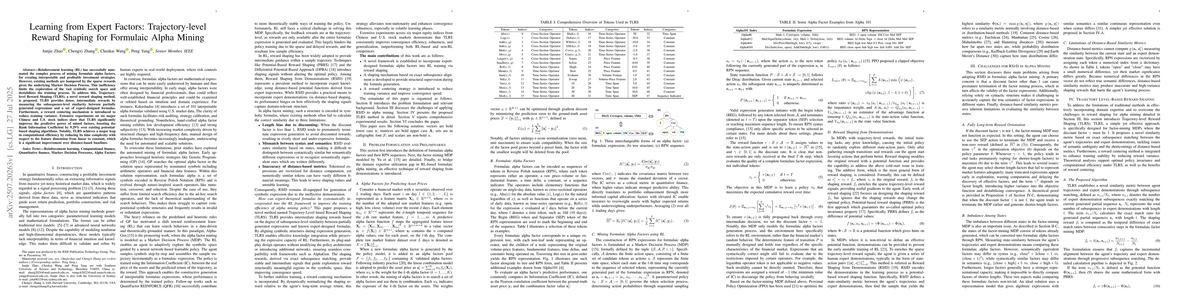 Reinforcement learning (RL) has successfully automated the complex process of mining formulaic alpha factors, for creating interpretable and profitable investment strategies. However, existing methods are hampered by the sparse rewards given the underlying Markov Decision Process. This inefficiency limits the exploration of the vast symbolic search space and destabilizes the training process. To address this, Trajectory-level Reward Shaping (TLRS), a novel reward shaping method, is proposed. TLRS provides dense, intermediate rewards by measuring the subsequence-level similarity between partially generated expressions and a set of expert-designed formulas. Furthermore, a reward centering mechanism is introduced to reduce training variance. Extensive experiments on six major Chinese and U.S. stock indices show that TLRS significantly improves the predictive power of mined factors, boosting the Rank Information Coefficient by 9.29% over existing potential-based shaping algorithms. Notably, TLRS achieves a major leap in computational efficiency by reducing its time complexity with respect to the feature dimension from linear to constant, which is a significant improvement over distance-based baselines.