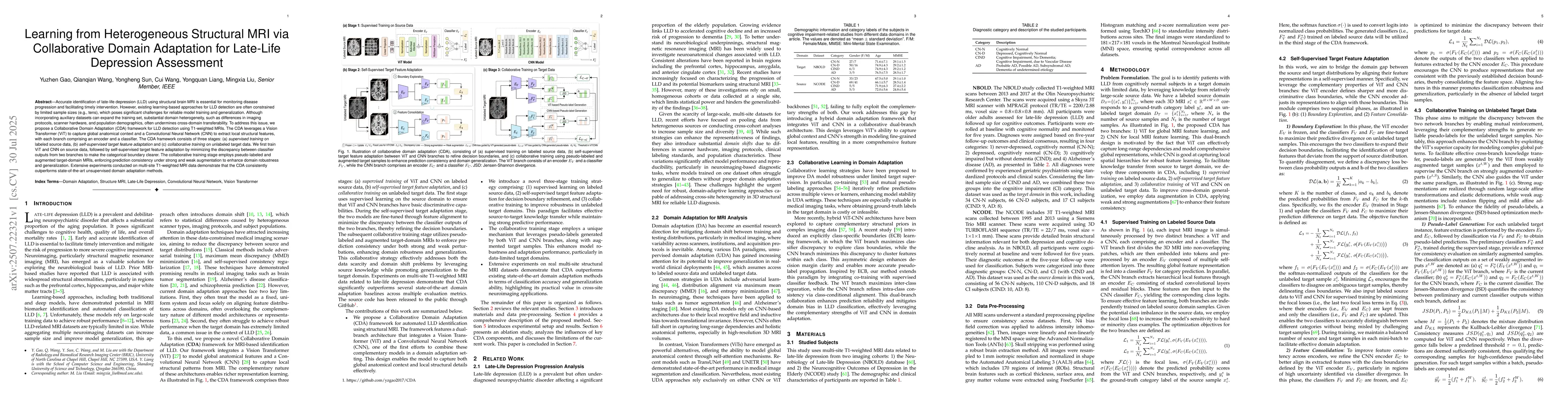 Accurate identification of late-life depression (LLD) using structural brain MRI is essential for monitoring disease progression and facilitating timely intervention. However, existing learning-based approaches for LLD detection are often constrained by limited sample sizes (e.g., tens), which poses significant challenges for reliable model training and generalization. Although incorporating auxiliary datasets can expand the training set, substantial domain heterogeneity, such as differences in imaging protocols, scanner hardware, and population demographics, often undermines cross-domain transferability. To address this issue, we propose a Collaborative Domain Adaptation (CDA) framework for LLD detection using T1-weighted MRIs. The CDA leverages a Vision Transformer (ViT) to capture global anatomical context and a Convolutional Neural Network (CNN) to extract local structural features, with each branch comprising an encoder and a classifier. The CDA framework consists of three stages: (a) supervised training on labeled source data, (b) self-supervised target feature adaptation and (c) collaborative training on unlabeled target data. We first train ViT and CNN on source data, followed by self-supervised target feature adaptation by minimizing the discrepancy between classifier outputs from two branches to make the categorical boundary clearer. The collaborative training stage employs pseudo-labeled and augmented target-domain MRIs, enforcing prediction consistency under strong and weak augmentation to enhance domain robustness and generalization. Extensive experiments conducted on multi-site T1-weighted MRI data demonstrate that the CDA consistently outperforms state-of-the-art unsupervised domain adaptation methods.