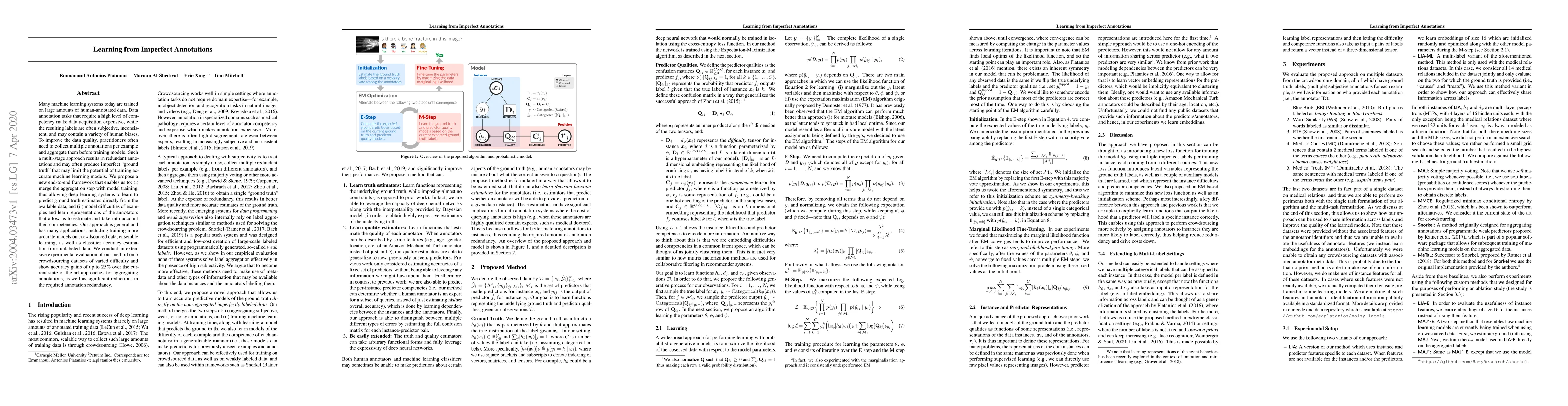 Many machine learning systems today are trained on large amounts of human-annotated data. Data annotation tasks that require a high level of competency make data acquisition expensive, while the resulting labels are often subjective, inconsistent, and may contain a variety of human biases. To improve the data quality, practitioners often need to collect multiple annotations per example and aggregate them before training models. Such a multi-stage approach results in redundant annotations and may often produce imperfect "ground truth" that may limit the potential of training accurate machine learning models. We propose a new end-to-end framework that enables us to: (i) merge the aggregation step with model training, thus allowing deep learning systems to learn to predict ground truth estimates directly from the available data, and (ii) model difficulties of examples and learn representations of the annotators that allow us to estimate and take into account their competencies. Our approach is general and has many applications, including training more accurate models on crowdsourced data, ensemble learning, as well as classifier accuracy estimation from unlabeled data. We conduct an extensive experimental evaluation of our method on 5 crowdsourcing datasets of varied difficulty and show accuracy gains of up to 25% over the current state-of-the-art approaches for aggregating annotations, as well as significant reductions in the required annotation redundancy.