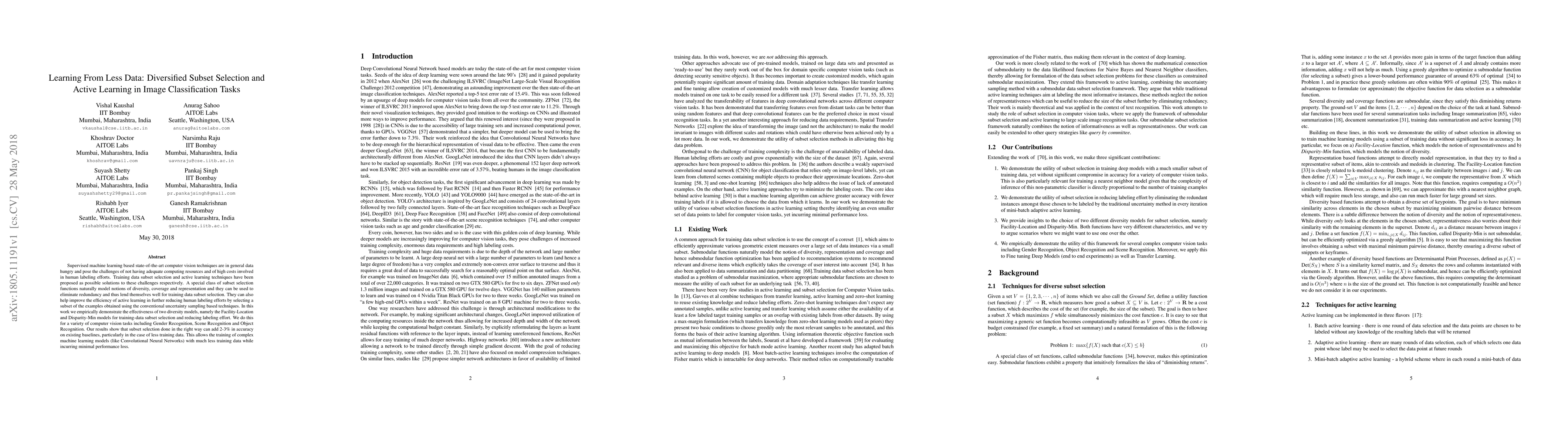 This paper explores subset selection and active learning techniques to address the data-hunger issue in supervised machine learning for computer vision tasks. It demonstrates the use of Facility-Location and Disparity-Min models for effective training data subset selection, achieving 2-3% accuracy improvement over baselines, especially with limited data, thus enabling the training of complex models with reduced labeling efforts.