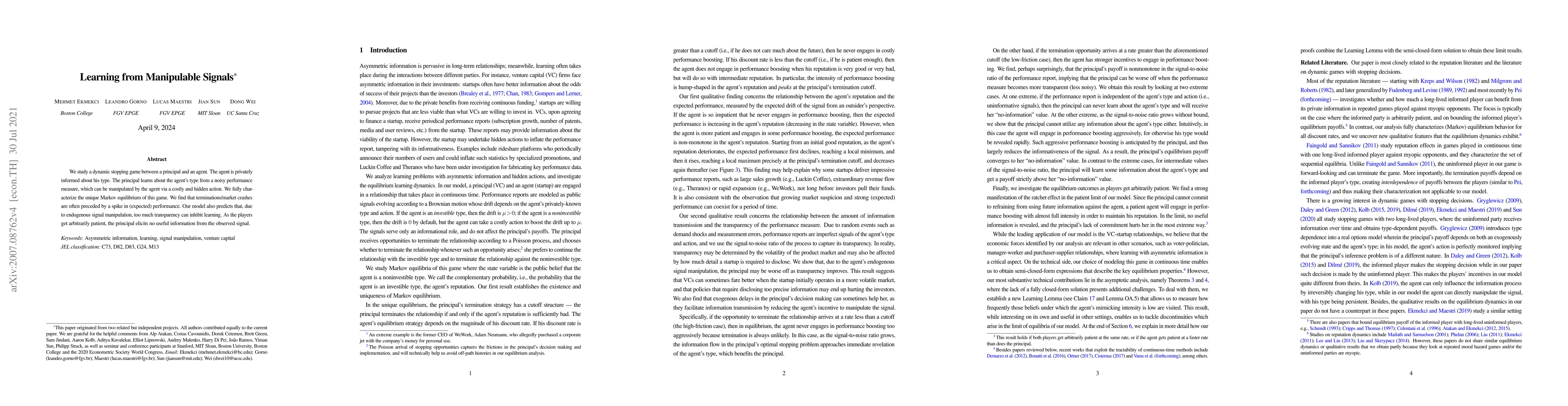 We study a dynamic stopping game between a principal and an agent. The agent is privately informed about his type. The principal learns about the agent's type from a noisy performance measure, which can be manipulated by the agent via a costly and hidden action. We fully characterize the unique Markov equilibrium of this game. We find that terminations/market crashes are often preceded by a spike in (expected) performance. Our model also predicts that, due to endogenous signal manipulation, too much transparency can inhibit learning. As the players get arbitrarily patient, the principal elicits no useful information from the observed signal.