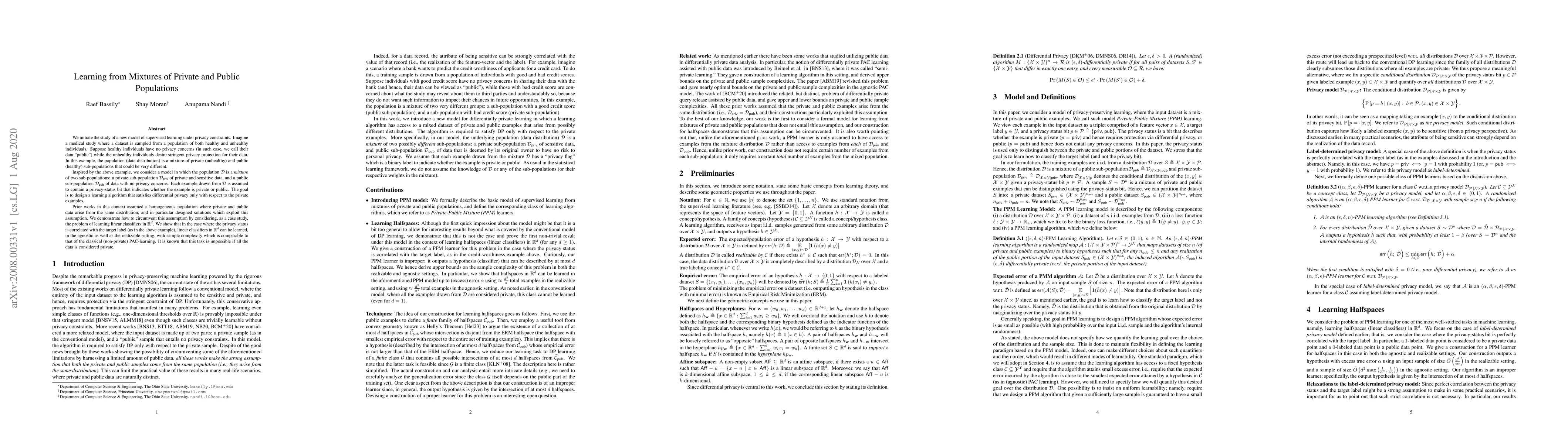 This paper introduces a supervised learning model under privacy constraints where the data comes from a mixture of private and public sub-populations. It proposes a learning algorithm that satisfies differential privacy only for private data, successfully learning linear classifiers in high dimensions despite the differing distributions of private and public data.