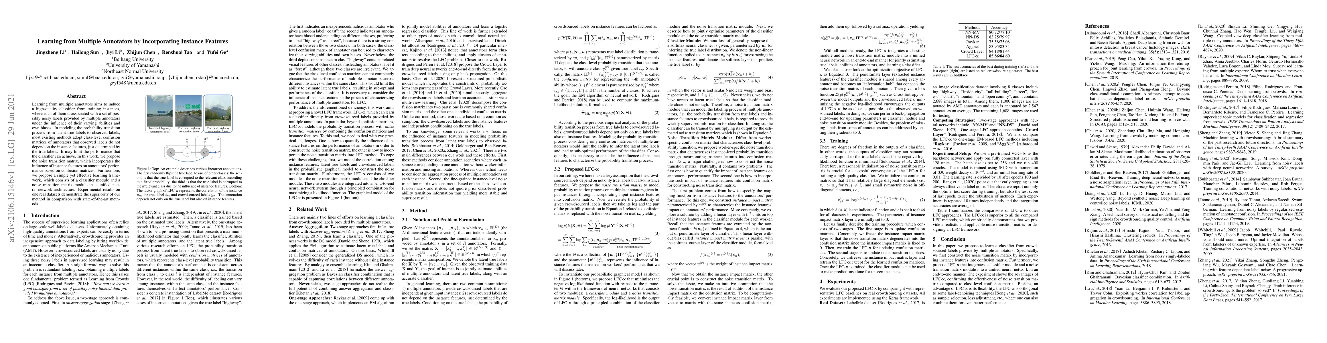 This paper proposes a method to improve classifier performance by incorporating instance features into a noise transition matrix, which models how annotators' performance varies with instance features. The method combines a classifier and noise transition matrix in a unified neural network, outperforming existing class-level confusion matrix approaches.