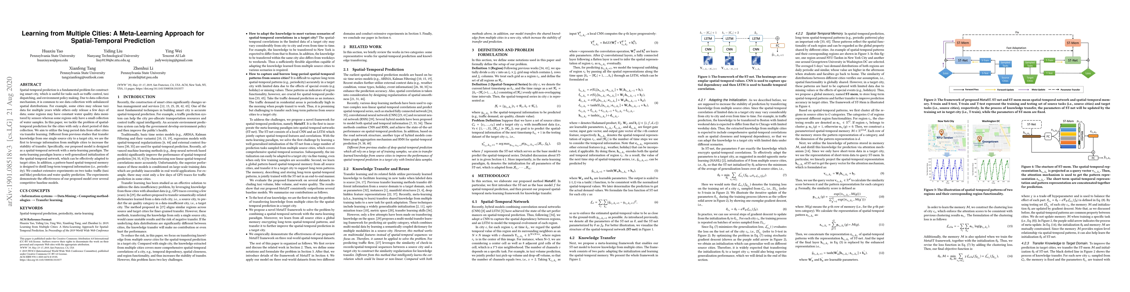 This paper proposes a meta-learning approach for spatial-temporal prediction across multiple cities, leveraging long-period data from various cities to improve short-data city predictions. The model uses a spatial-temporal network with a meta-learning paradigm and a pattern-based memory to distill temporal information, showing superior performance in traffic and water quality prediction tasks.