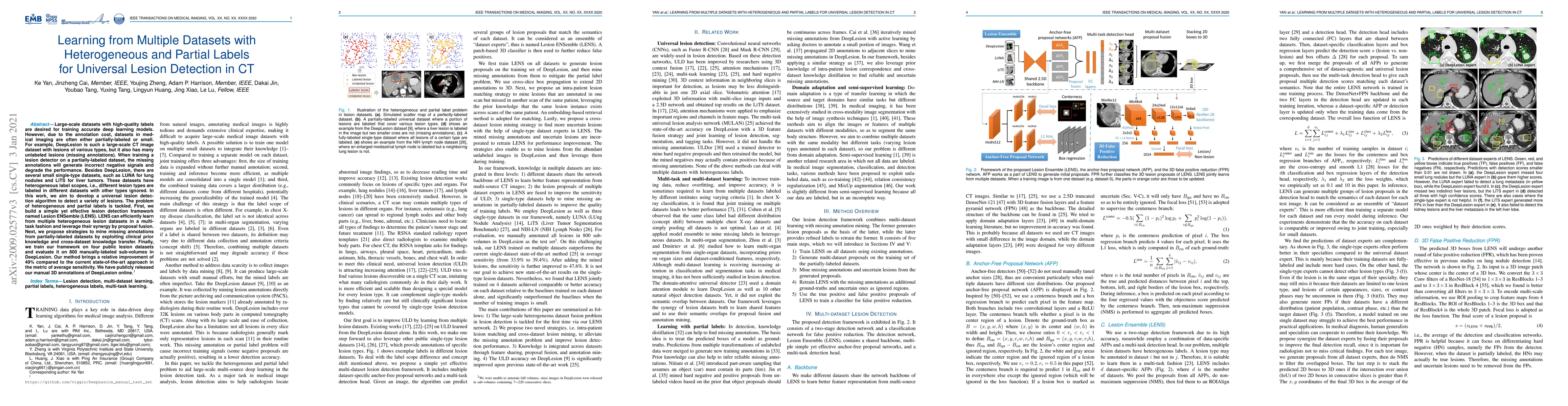 This paper proposes a universal lesion detection algorithm named Lesion ENSemble (LENS) to tackle the challenges of heterogeneous and partial labels in medical imaging datasets. LENS efficiently learns from multiple datasets through multi-task learning and proposal fusion, and improves detection performance by mining missing annotations using clinical knowledge and cross-dataset knowledge transfer, achieving a 49% relative improvement in sensitivity compared to the current best method.