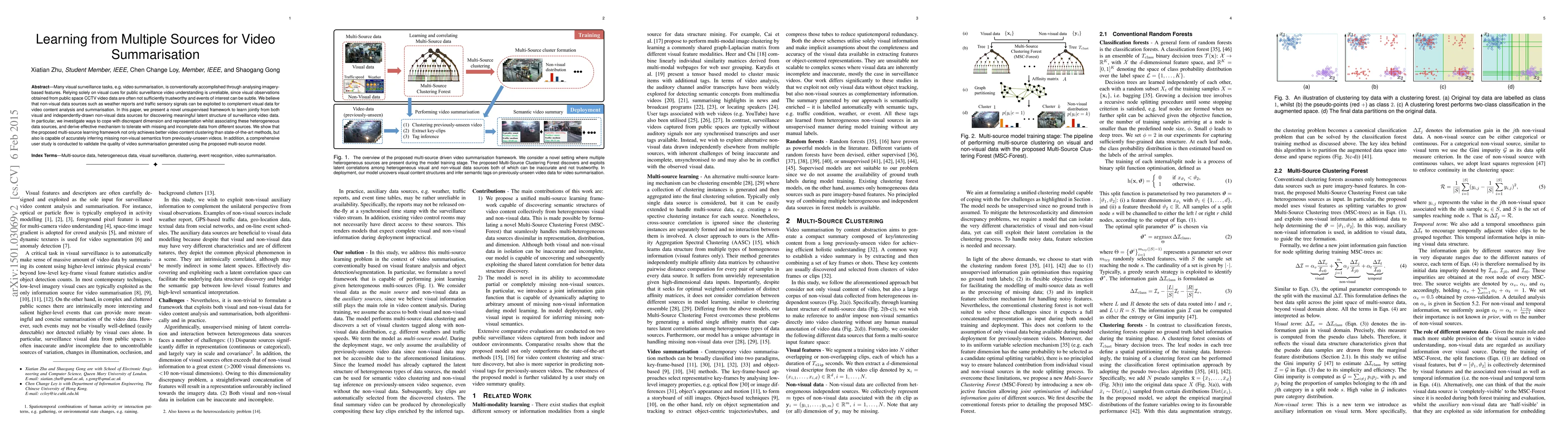 Many visual surveillance tasks, e.g.video summarisation, is conventionally accomplished through analysing imagerybased features. Relying solely on visual cues for public surveillance video understanding is unreliable, since visual observations obtained from public space CCTV video data are often not sufficiently trustworthy and events of interest can be subtle. On the other hand, non-visual data sources such as weather reports and traffic sensory signals are readily accessible but are not explored jointly to complement visual data for video content analysis and summarisation. In this paper, we present a novel unsupervised framework to learn jointly from both visual and independently-drawn non-visual data sources for discovering meaningful latent structure of surveillance video data. In particular, we investigate ways to cope with discrepant dimension and representation whist associating these heterogeneous data sources, and derive effective mechanism to tolerate with missing and incomplete data from different sources. We show that the proposed multi-source learning framework not only achieves better video content clustering than state-of-the-art methods, but also is capable of accurately inferring missing non-visual semantics from previously unseen videos. In addition, a comprehensive user study is conducted to validate the quality of video summarisation generated using the proposed multi-source model.