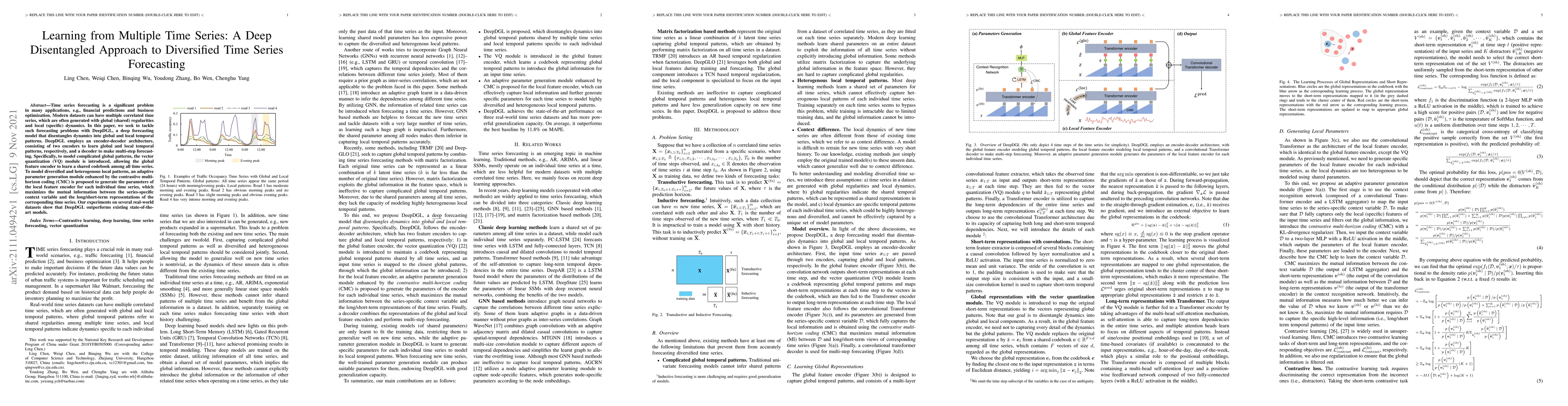 This paper introduces DeepDGL, a deep learning model for diversified time series forecasting that disentangles global and local temporal patterns. DeepDGL employs an encoder-decoder architecture with vector quantization and contrastive multi-horizon coding, achieving superior performance on real-world datasets.