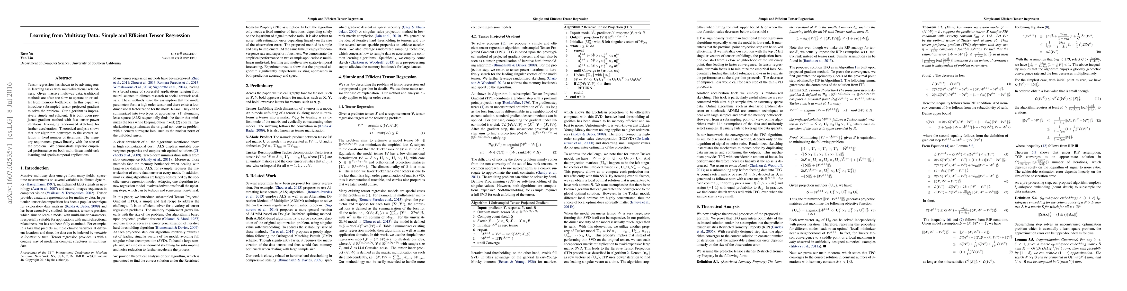 This paper proposes a subsampled tensor projected gradient method for efficient tensor regression on large multiway data, utilizing fast tensor power iterations and randomized sketching. The algorithm demonstrates theoretical convergence and linear memory growth, outperforming traditional methods in empirical multi-linear multi-task learning and spatio-temporal applications.