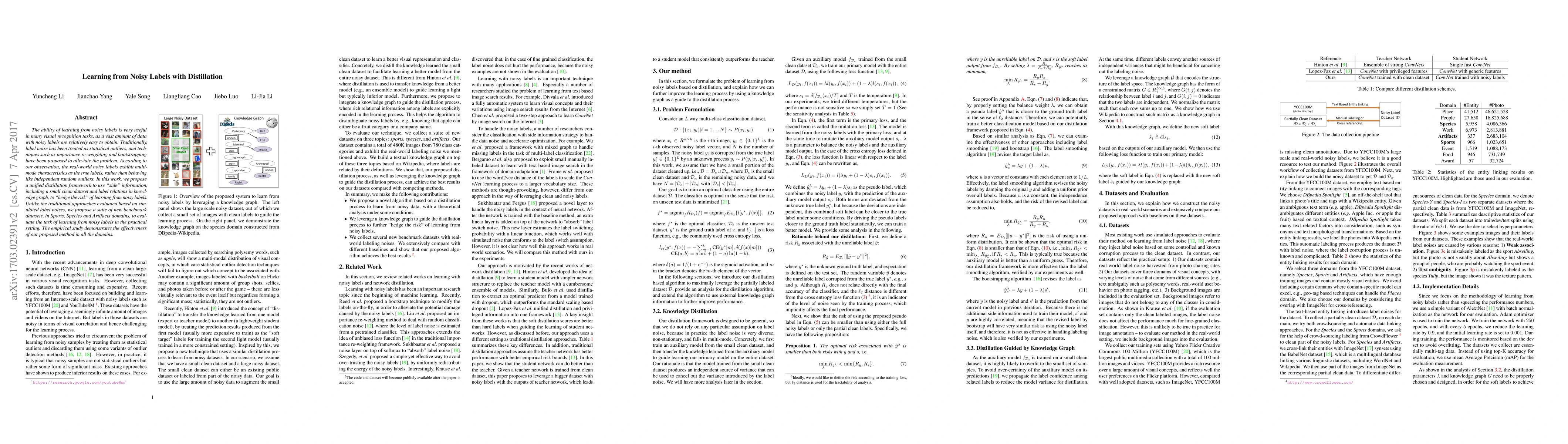 This paper proposes a unified distillation framework to tackle the issue of learning from noisy labels in visual recognition tasks by leveraging side information, including a clean dataset and knowledge graph label relations. It introduces new benchmark datasets to evaluate practical scenarios, demonstrating the method's effectiveness across Sports, Species, and Artifacts domains.