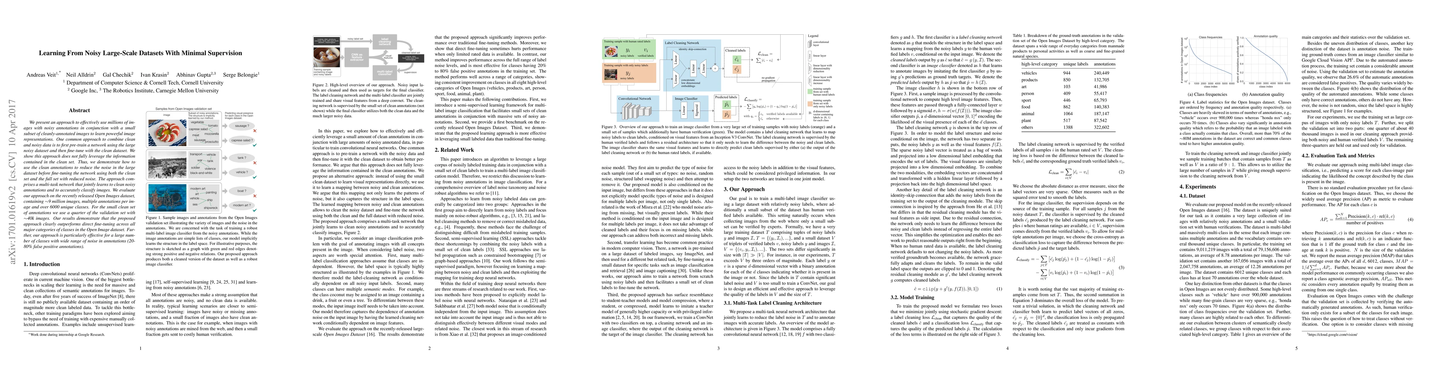 We present an approach to effectively use millions of images with noisy annotations in conjunction with a small subset of cleanly-annotated images to learn powerful image representations. One common approach to combine clean and noisy data is to first pre-train a network using the large noisy dataset and then fine-tune with the clean dataset. We show this approach does not fully leverage the information contained in the clean set. Thus, we demonstrate how to use the clean annotations to reduce the noise in the large dataset before fine-tuning the network using both the clean set and the full set with reduced noise. The approach comprises a multi-task network that jointly learns to clean noisy annotations and to accurately classify images. We evaluate our approach on the recently released Open Images dataset, containing ~9 million images, multiple annotations per image and over 6000 unique classes. For the small clean set of annotations we use a quarter of the validation set with ~40k images. Our results demonstrate that the proposed approach clearly outperforms direct fine-tuning across all major categories of classes in the Open Image dataset. Further, our approach is particularly effective for a large number of classes with wide range of noise in annotations (20-80% false positive annotations).