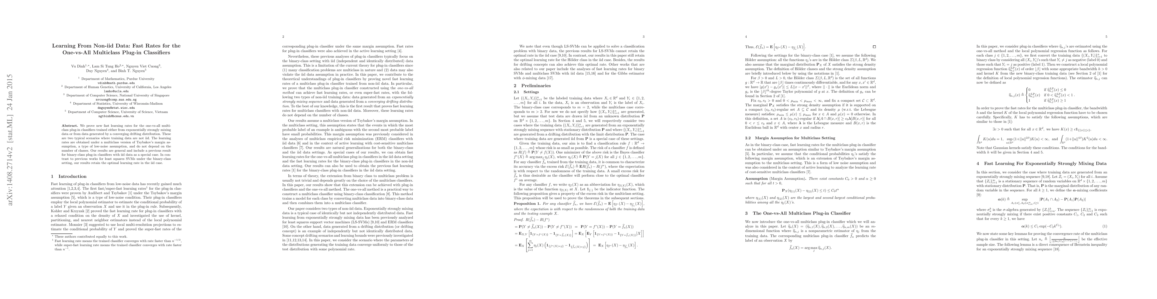 This paper establishes fast learning rates for one-vs-all multiclass plug-in classifiers trained on non-iid data, including scenarios with exponentially strong mixing or drifting distributions. The results are general and do not depend on the number of classes, retaining optimal rates even in the iid case.