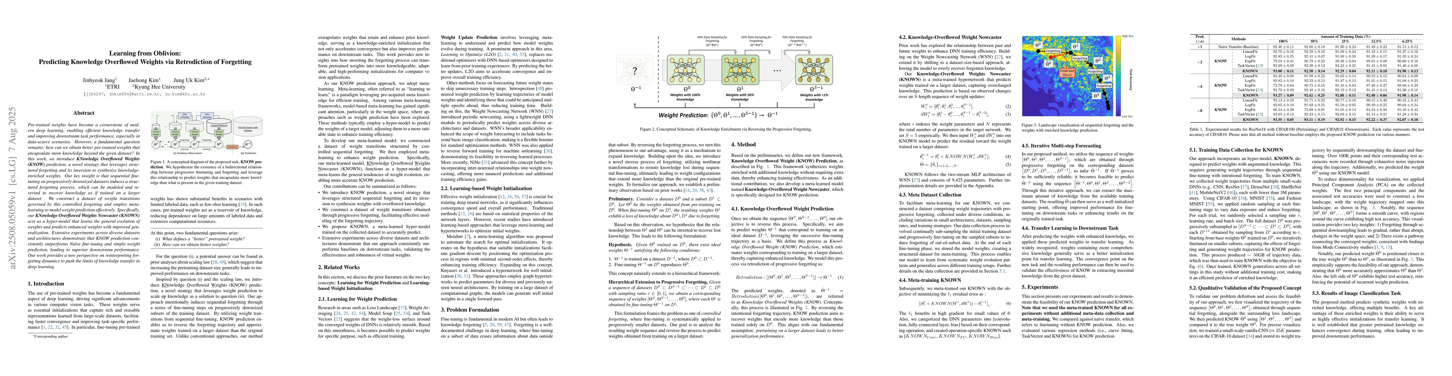 Pre-trained weights have become a cornerstone of modern deep learning, enabling efficient knowledge transfer and improving downstream task performance, especially in data-scarce scenarios. However, a fundamental question remains: how can we obtain better pre-trained weights that encapsulate more knowledge beyond the given dataset? In this work, we introduce \textbf{KNowledge Overflowed Weights (KNOW)} prediction, a novel strategy that leverages structured forgetting and its inversion to synthesize knowledge-enriched weights. Our key insight is that sequential fine-tuning on progressively downsized datasets induces a structured forgetting process, which can be modeled and reversed to recover knowledge as if trained on a larger dataset. We construct a dataset of weight transitions governed by this controlled forgetting and employ meta-learning to model weight prediction effectively. Specifically, our \textbf{KNowledge Overflowed Weights Nowcaster (KNOWN)} acts as a hyper-model that learns the general evolution of weights and predicts enhanced weights with improved generalization. Extensive experiments across diverse datasets and architectures demonstrate that KNOW prediction consistently outperforms Na\"ive fine-tuning and simple weight prediction, leading to superior downstream performance. Our work provides a new perspective on reinterpreting forgetting dynamics to push the limits of knowledge transfer in deep learning.