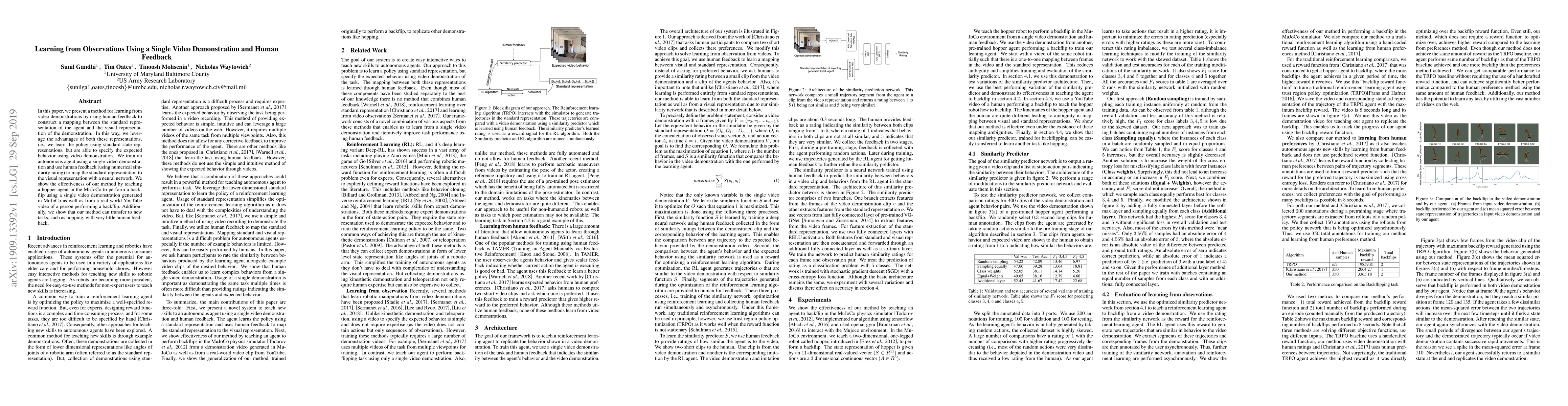 This paper introduces a method for learning from a single video demonstration by combining human feedback with neural networks to map standard agent representations to visual demonstrations. The method effectively teaches a hopper agent to perform a backflip using both simulated and real-world video demonstrations, demonstrating transferability to new tasks with minimal additional human feedback.