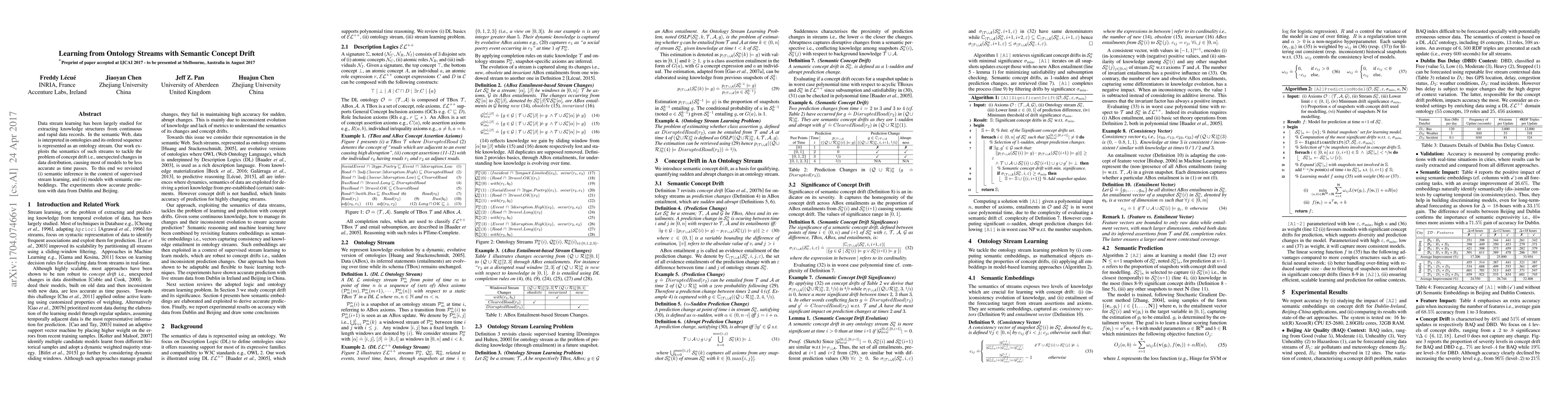 Data stream learning has been largely studied for extracting knowledge structures from continuous and rapid data records. In the semantic Web, data is interpreted in ontologies and its ordered sequence is represented as an ontology stream. Our work exploits the semantics of such streams to tackle the problem of concept drift i.e., unexpected changes in data distribution, causing most of models to be less accurate as time passes. To this end we revisited (i) semantic inference in the context of supervised stream learning, and (ii) models with semantic embeddings. The experiments show accurate prediction with data from Dublin and Beijing.