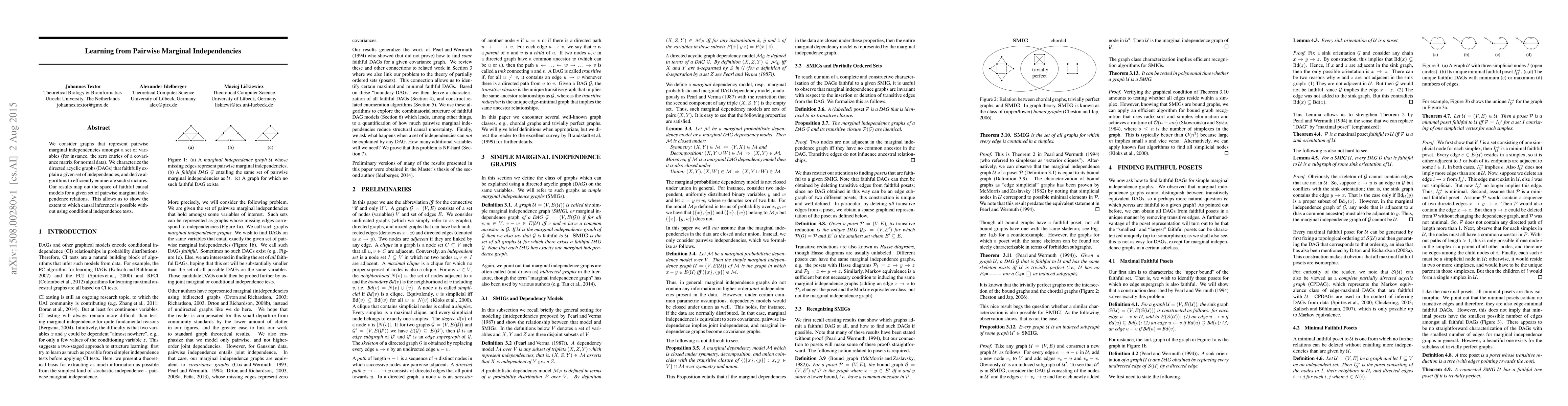 We consider graphs that represent pairwise marginal independencies amongst a set of variables (for instance, the zero entries of a covariance matrix for normal data). We characterize the directed acyclic graphs (DAGs) that faithfully explain a given set of independencies, and derive algorithms to efficiently enumerate such structures. Our results map out the space of faithful causal models for a given set of pairwise marginal independence relations. This allows us to show the extent to which causal inference is possible without using conditional independence tests.