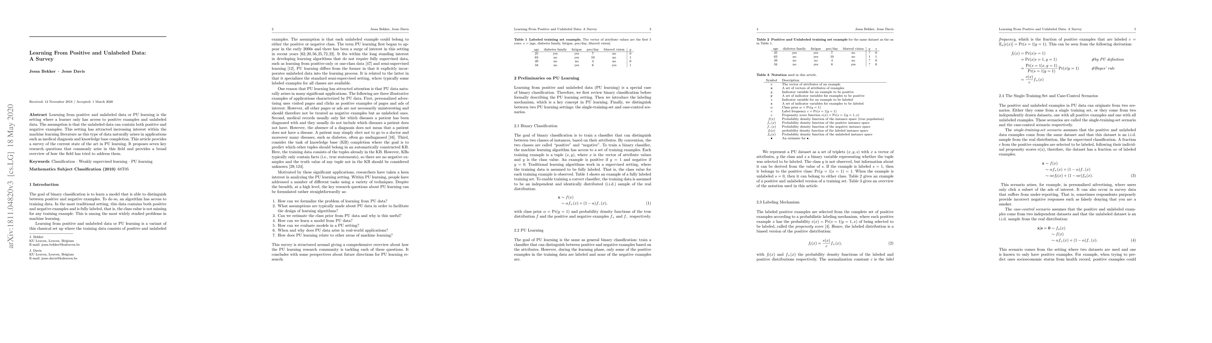 The paper provides a comprehensive survey of Positive-Unlabeled (PU) learning, a machine learning setting where a learner has access only to positive examples and unlabeled data, which may contain both positive and negative examples.