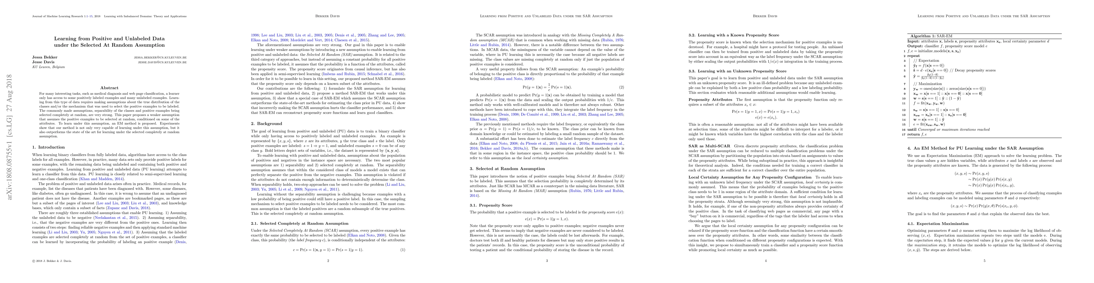 This paper proposes a new learning method under the assumption that positive examples are selected at random conditioned on certain attributes, rather than completely at random. An EM algorithm is developed to implement this approach, which outperforms existing methods that rely on stronger assumptions.
