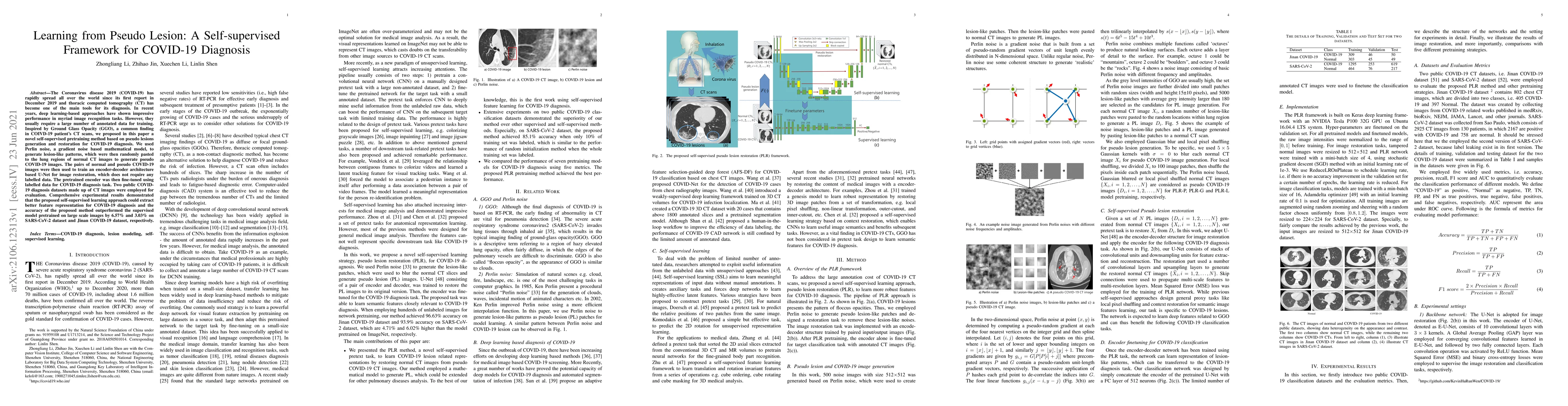 This paper proposes a self-supervised learning framework for COVID-19 diagnosis using pseudo lesion generation and restoration. The method generates pseudo COVID-19 images by adding Perlin noise to normal CT scans, trains an encoder-decoder model without labeled data, and fine-tunes with labeled data for diagnosis, achieving superior accuracy compared to supervised models.