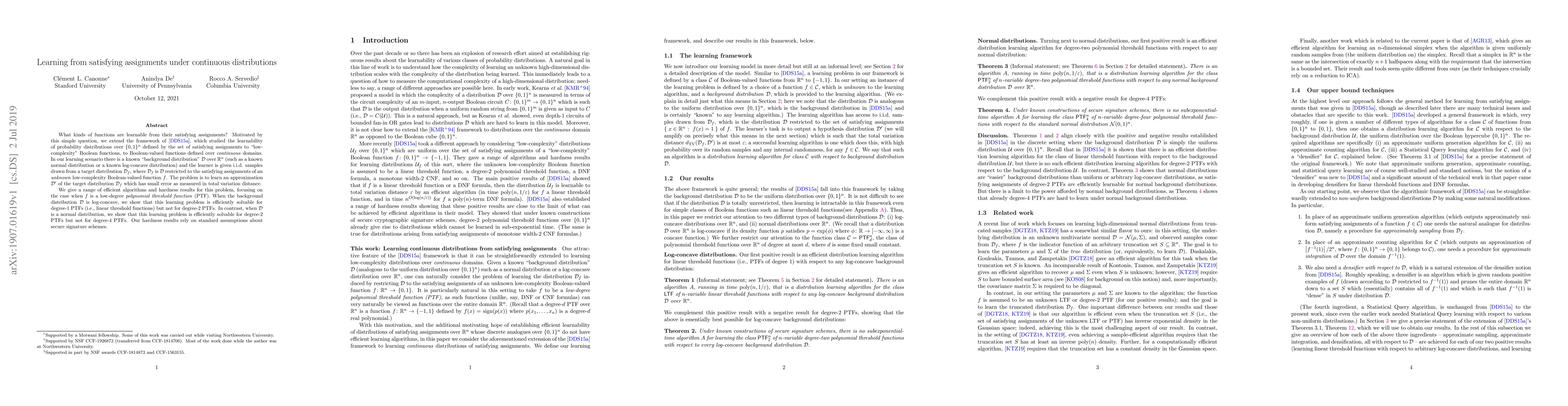 This paper explores the learnability of probability distributions over continuous domains defined by satisfying assignments to low-complexity Boolean functions. It presents efficient algorithms and hardness results for learning these distributions under various background distributions, focusing on low-degree polynomial threshold functions.