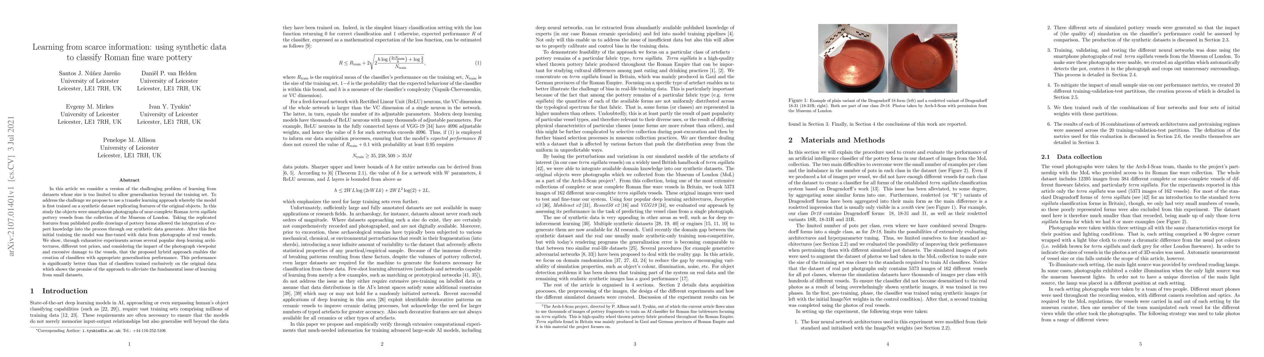 This paper proposes a transfer learning approach using synthetic data to classify Roman pottery from limited real-world photographs, demonstrating improved generalization performance compared to models trained solely on the scarce original data. The synthetic data incorporates expert knowledge from published drawings, showing promise in addressing the challenge of learning from small datasets.
