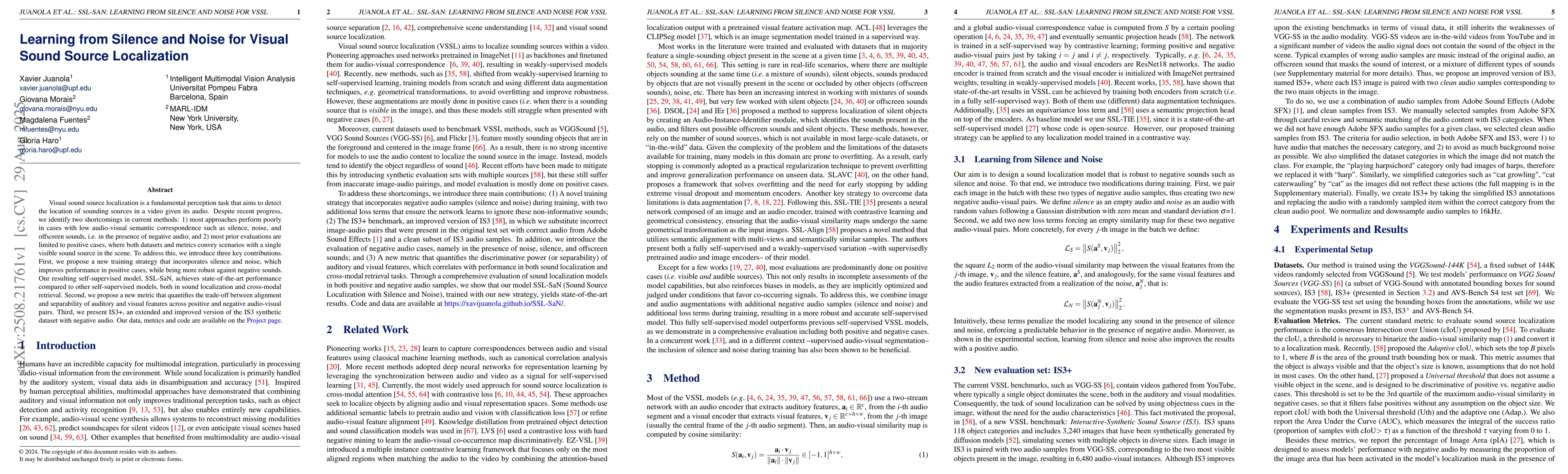Visual sound source localization is a fundamental perception task that aims to detect the location of sounding sources in a video given its audio. Despite recent progress, we identify two shortcomings in current methods: 1) most approaches perform poorly in cases with low audio-visual semantic correspondence such as silence, noise, and offscreen sounds, i.e. in the presence of negative audio; and 2) most prior evaluations are limited to positive cases, where both datasets and metrics convey scenarios with a single visible sound source in the scene. To address this, we introduce three key contributions. First, we propose a new training strategy that incorporates silence and noise, which improves performance in positive cases, while being more robust against negative sounds. Our resulting self-supervised model, SSL-SaN, achieves state-of-the-art performance compared to other self-supervised models, both in sound localization and cross-modal retrieval. Second, we propose a new metric that quantifies the trade-off between alignment and separability of auditory and visual features across positive and negative audio-visual pairs. Third, we present IS3+, an extended and improved version of the IS3 synthetic dataset with negative audio. Our data, metrics and code are available on the https://xavijuanola.github.io/SSL-SaN/.